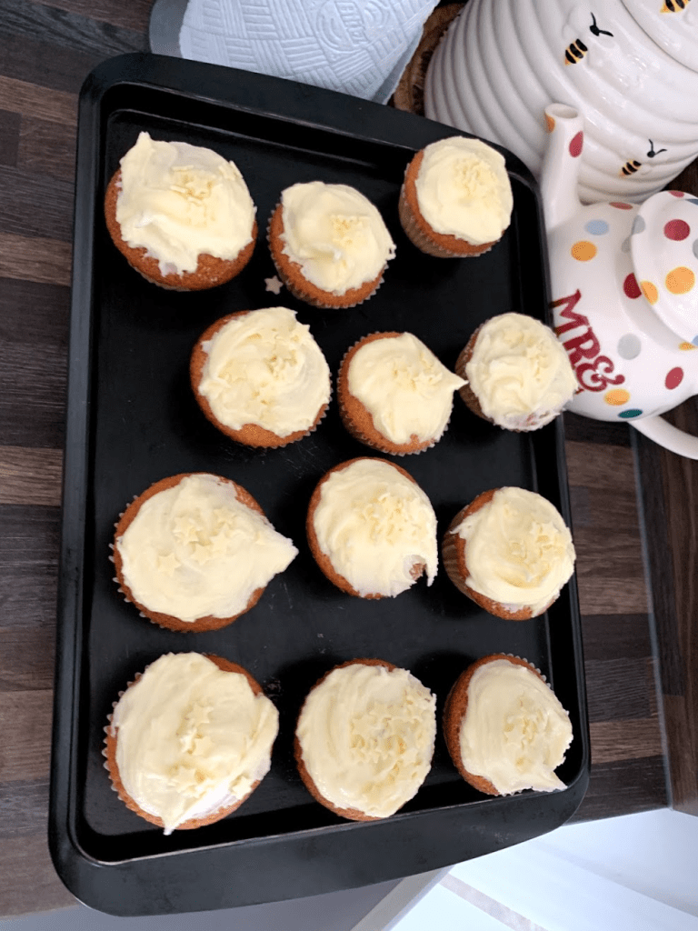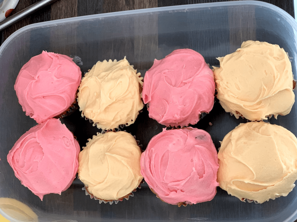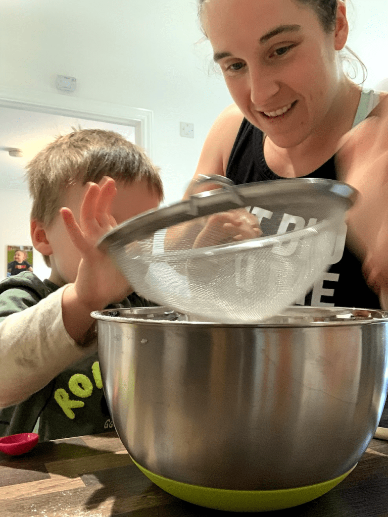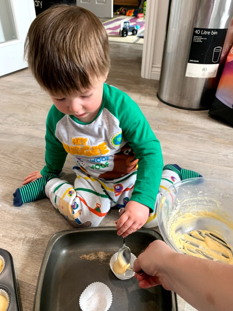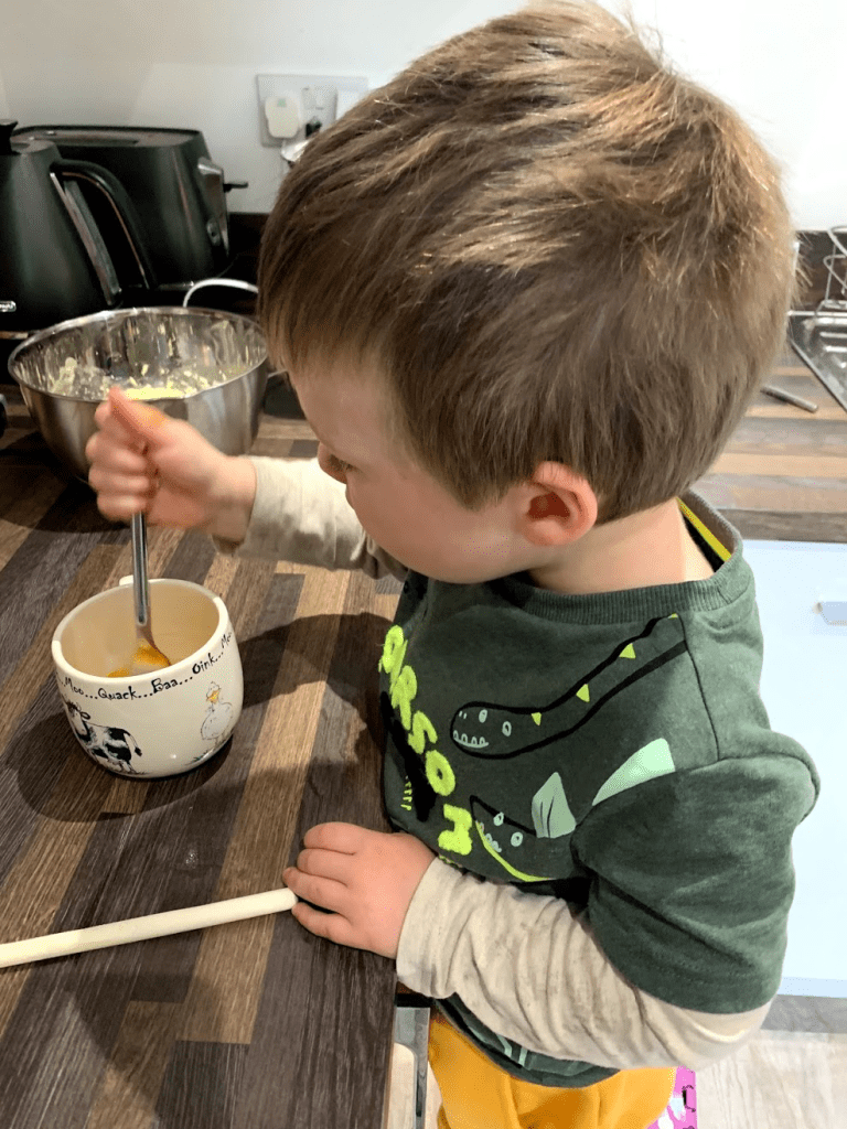 We decided to make these cupcakes again on Daddy’s request but added raisins to the cake mixture and food colouring to the buttercream icing. They were a real hit! Robbie loved cracking and mixing the eggs.