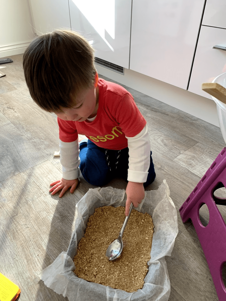 What do you do when you can’t get flour due to COVID-19, but have plenty of oats? You make flapjack of course! This was a nice change from baking cakes and was very easy for Robbie to help out with. I think we baked them for a tiny bit too long as they were a little chewy and crumbly. They were still delicious, though.