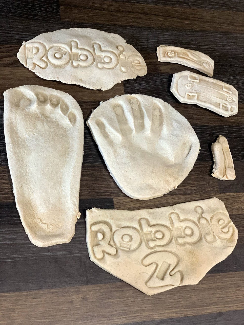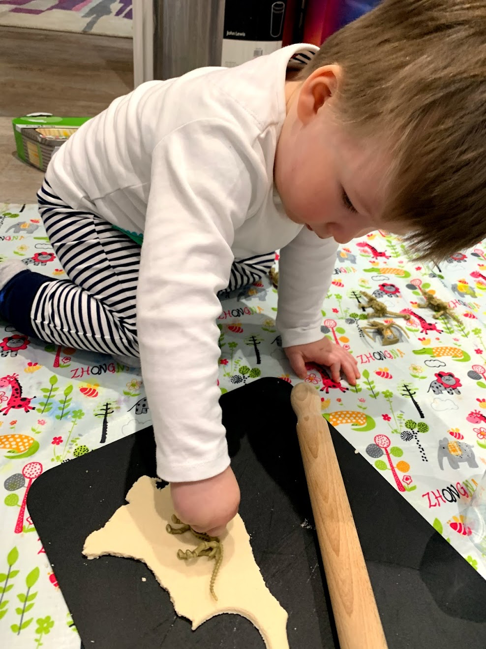 We incorporated it into several of our themes and used it mainly to stamp different objects such as our dinosaur skeletons to make fossils, letters and numbers and Robbie’s hands and feet to make a Lockdown 2020 keepsake.