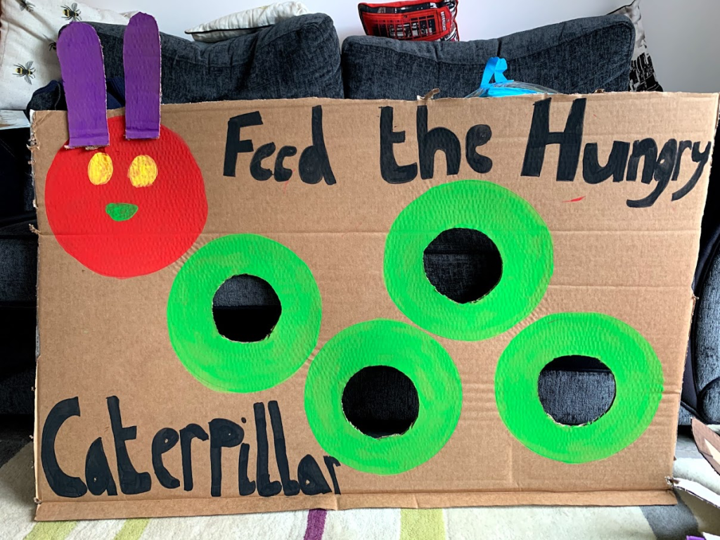 Feed the caterpillar 2 – resources: cardboard, paint, scissors/Stanley knife, play food.