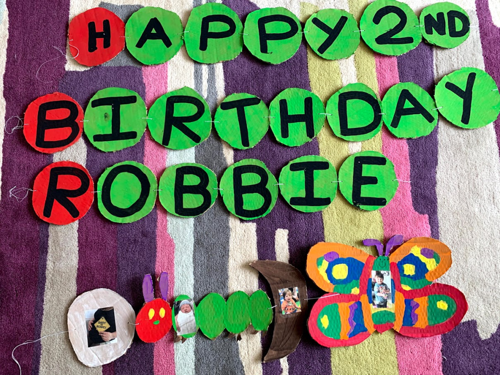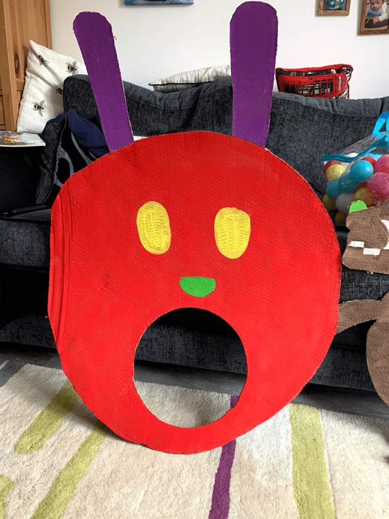Due to our family needing to shield during lockdown (2020) I couldn’t get out to the shops to buy Robbie banners for his birthday. I could have ordered them online but thought I’d do one better and make them for him. To do this I used the remaining cardboard from the large box used to make the other games and used the tapas-style dish to draw round for the circles. I also drew an egg, caterpillar, chrysalis and butterfly freehand. I cut these out using a Stanley knife and painted them using Robbie’s paint. I used black paint to write the letters freehand, printed pictures and stuck them on. To attach them together I used thread and a large sewing needle to poke the holes and take the thread through.