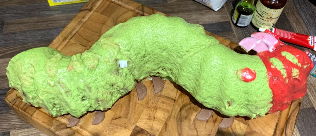 Caterpillar Birthday cake – resources: Bundt tin, marble cake recipe, green/red food colouring, party rings, chocolate buttons.