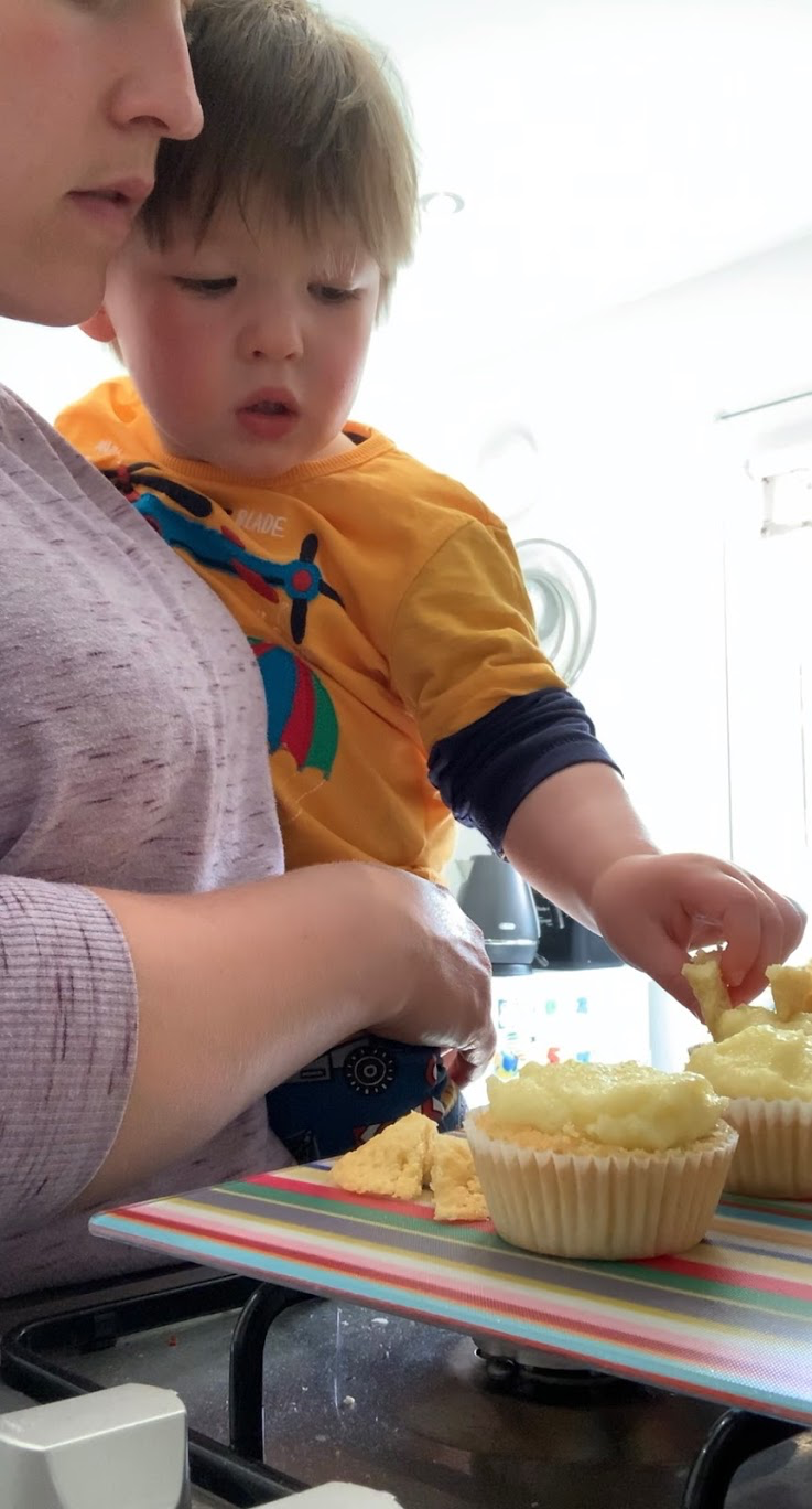 Again as I couldn’t get to a shop to choose Robbie’s birthday cake I decided to make him one instead. I borrowed a Bundt tin from my mum and used a straightforward marble cake recipe from BBC Good Food to make a round cake. I cut this into thirds, turning two around to make the caterpillar shape. I used buttercream and jam to stick the sections together and then buttercream with food colouring through it to make the icing. I didn’t have icing sugar however as we couldn’t get any through our Asda deliveries so I tried to crush caster sugar to make the buttercream which left it a little bit grainy and left the icing with this interesting, rustic, textured look. I used a party ring broken in half for the feelers and giant chocolate buttons halved for its feet.