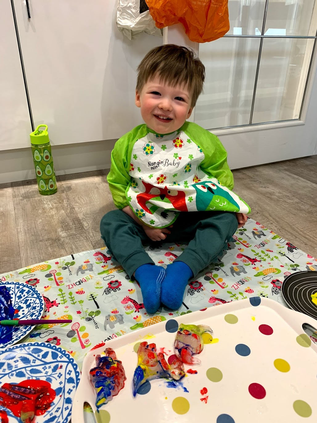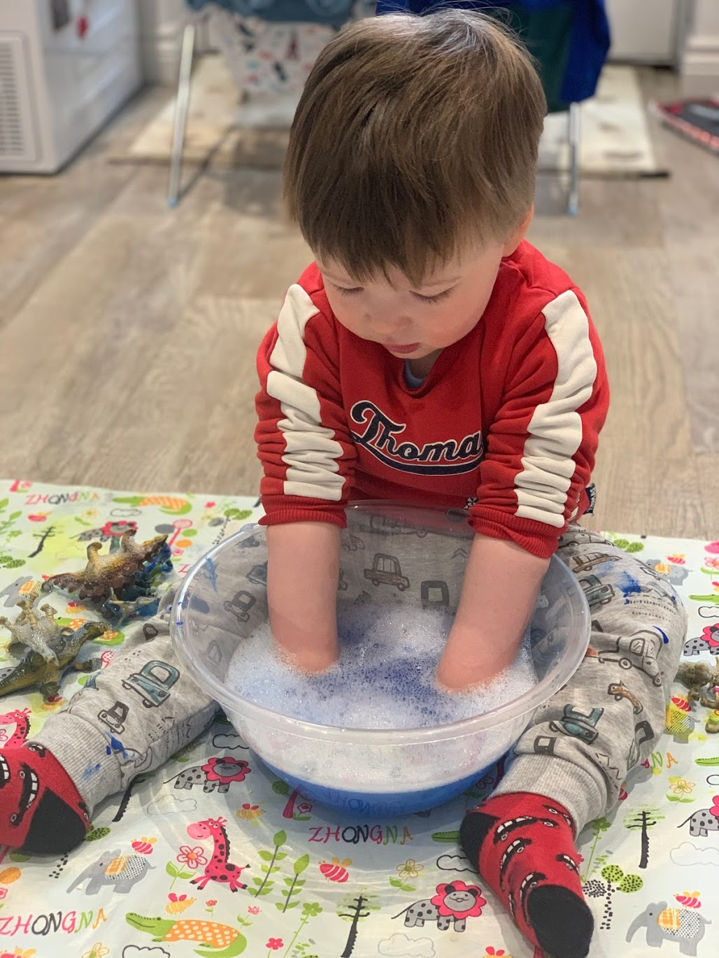 I placed the messy play materials into separate plastic bowls and set these on a wipeable mat along with Robbie’s dinosaur toys and assorted utensils.