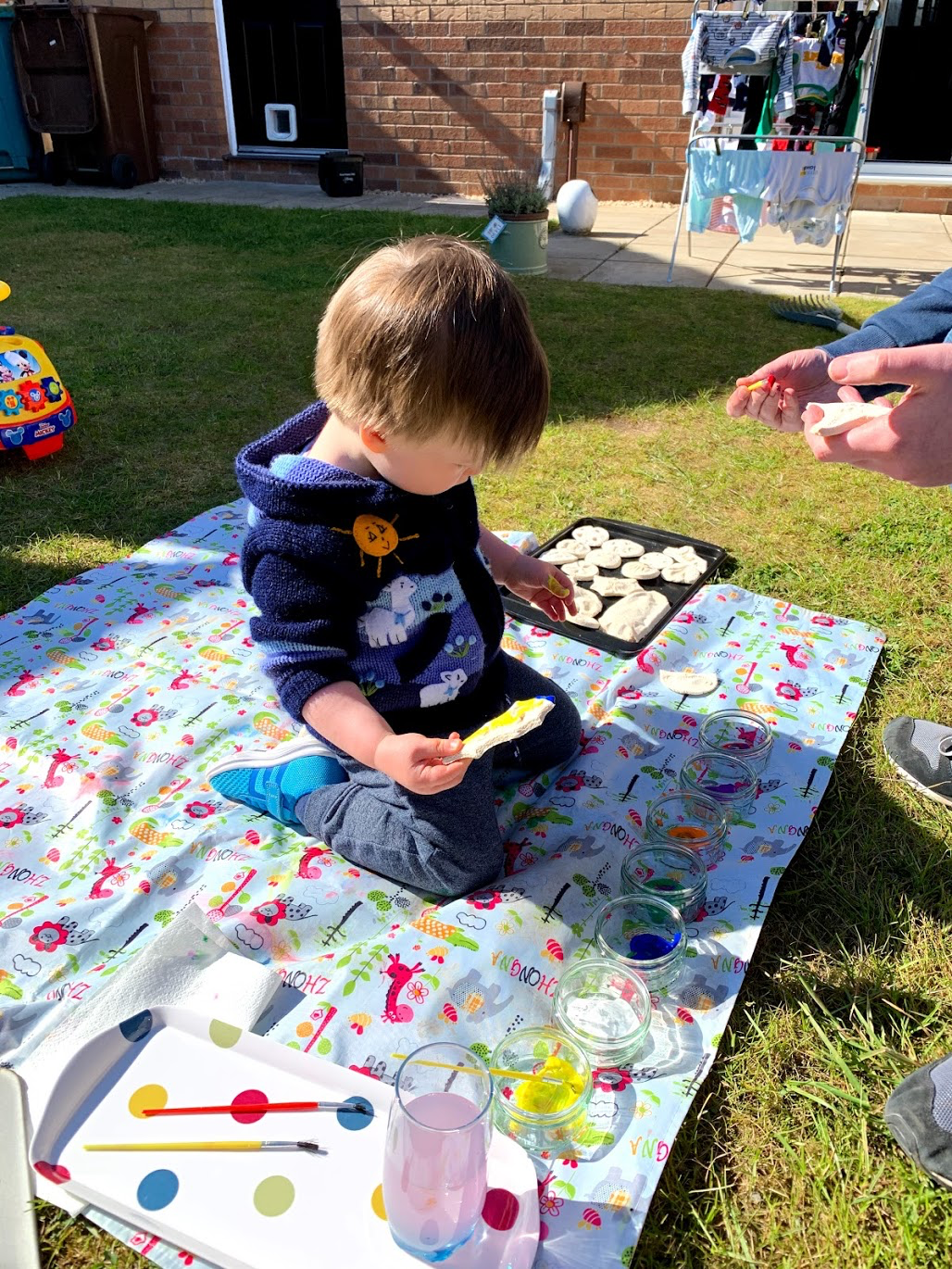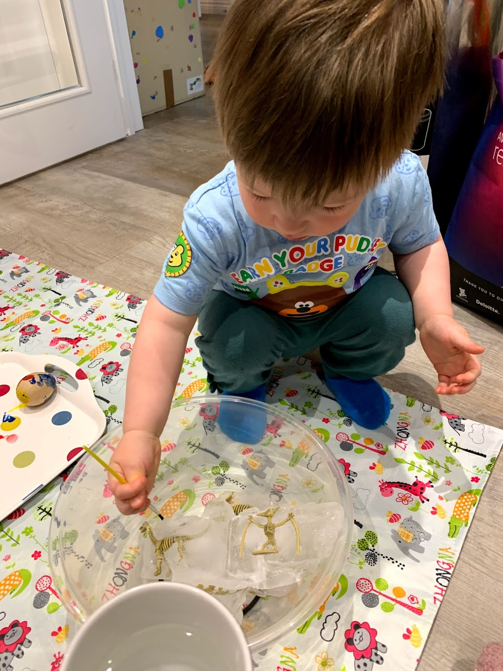 This was a different way to explore painting and our dinosaurs. I filled our dinosaur ice cube tray with water and popped it in the freezer for a few hours. When we were ready to do the activity I pressed them out onto a tray and gave Robbie different coloured paints and brushes. He had a great time painting the frozen dinosaurs and watching them melt.