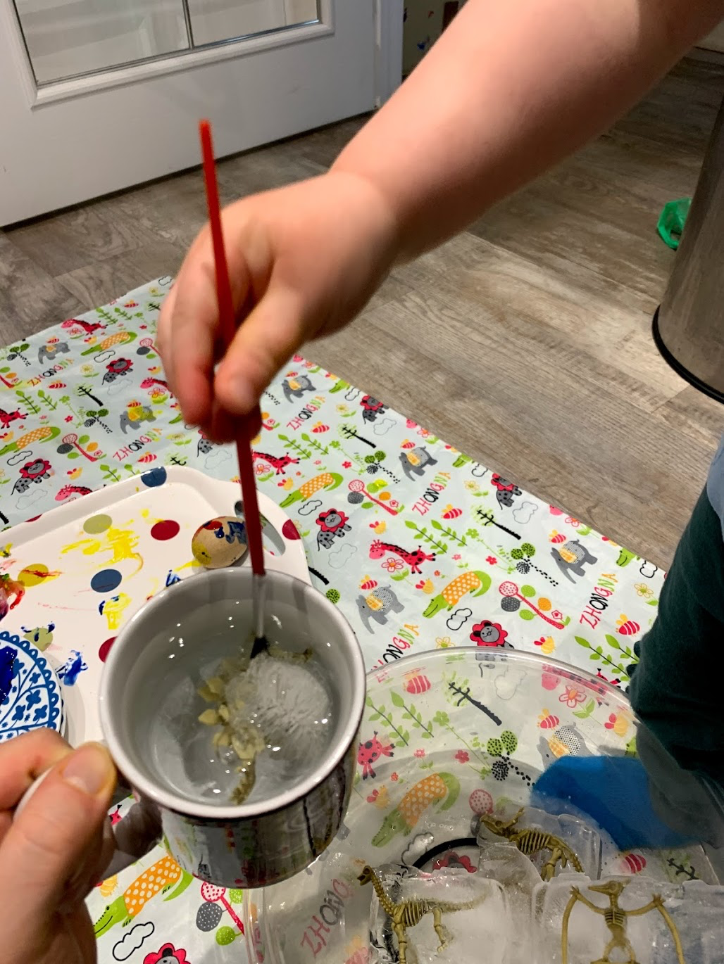 We put dinosaur skeleton toys into ice cube trays with some water and put them in the freezer for a few hours. Then we pushed them out and experiments to see what the best way was to melt the ice and free them using different utensils.