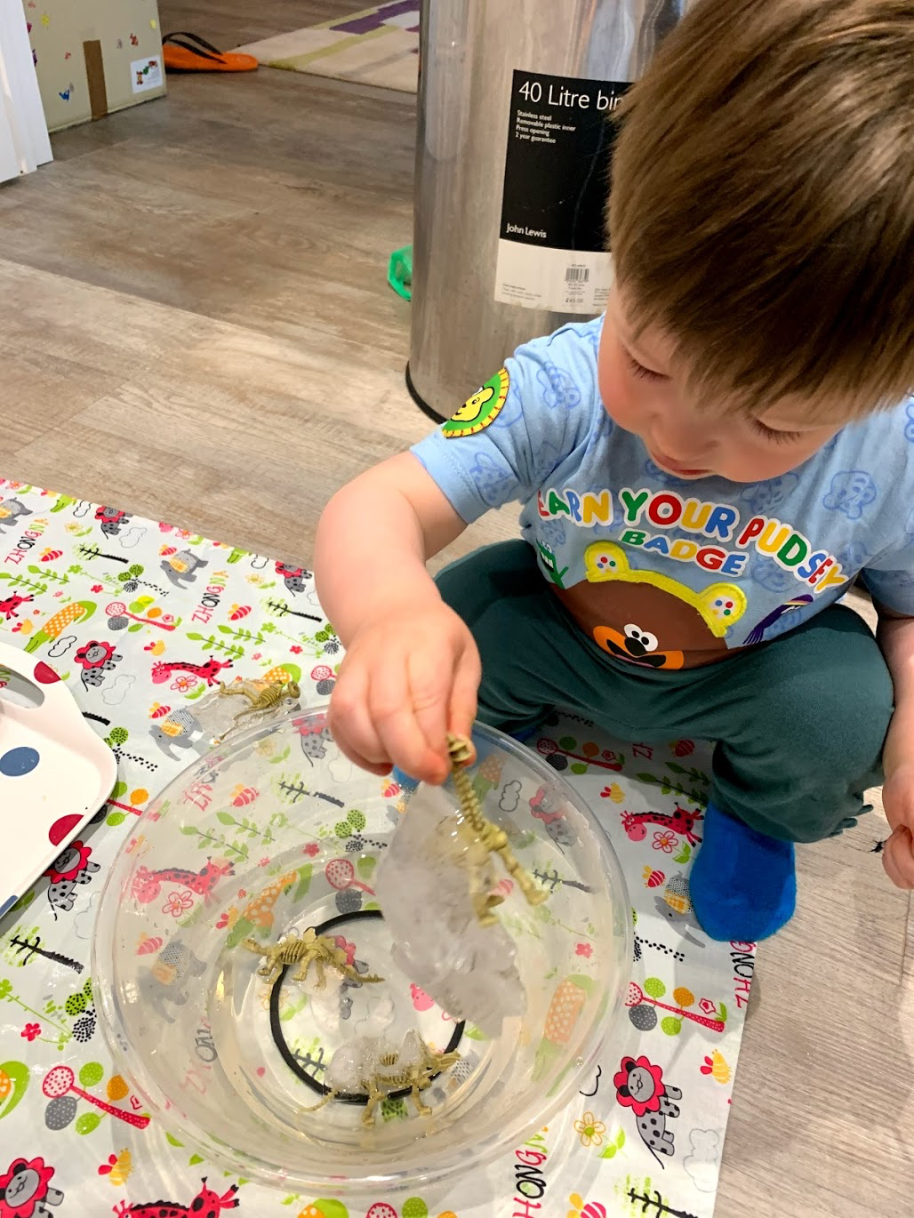 Melting Dinosaur Fossils – resources: ice cube tray, dinosaur/dinosaur skeleton toys, water, paintbrushes, Calpol syringe, sponges, big bowls.