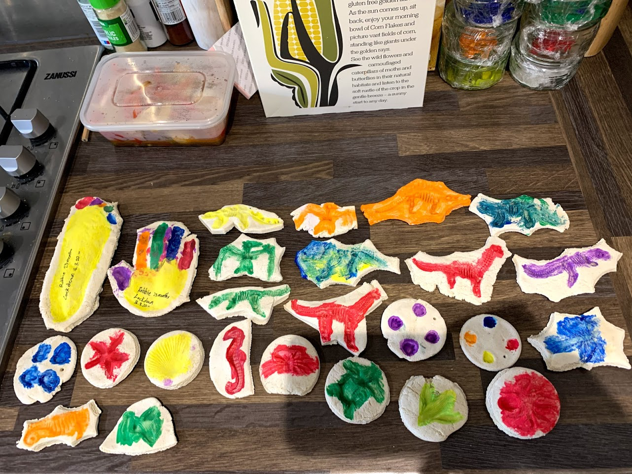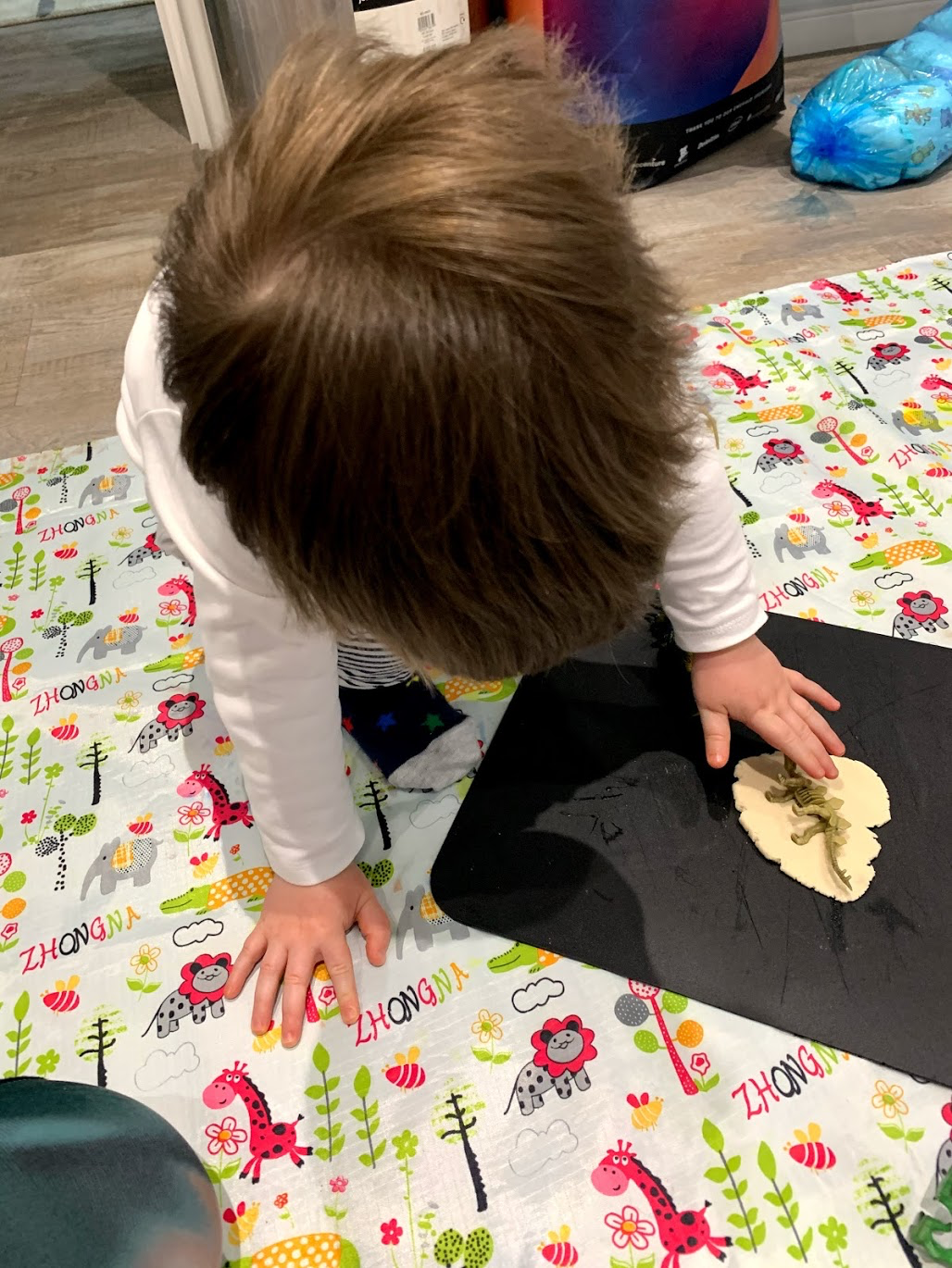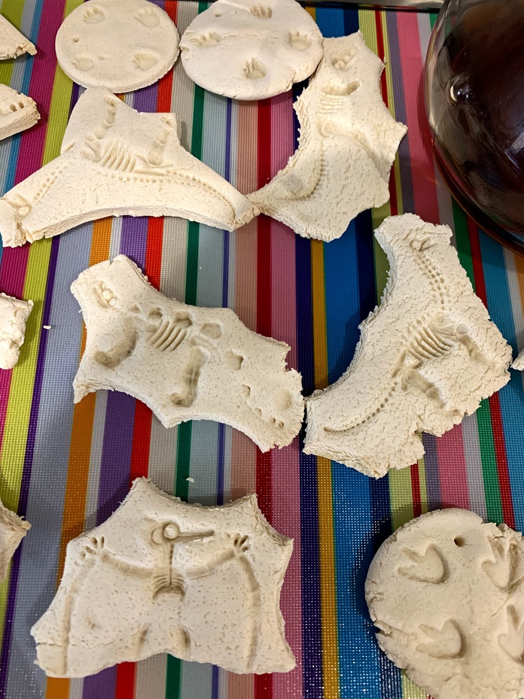resources: dinosaur skeleton toys, rolling pin, glass or butter knife (to cut out fossils).