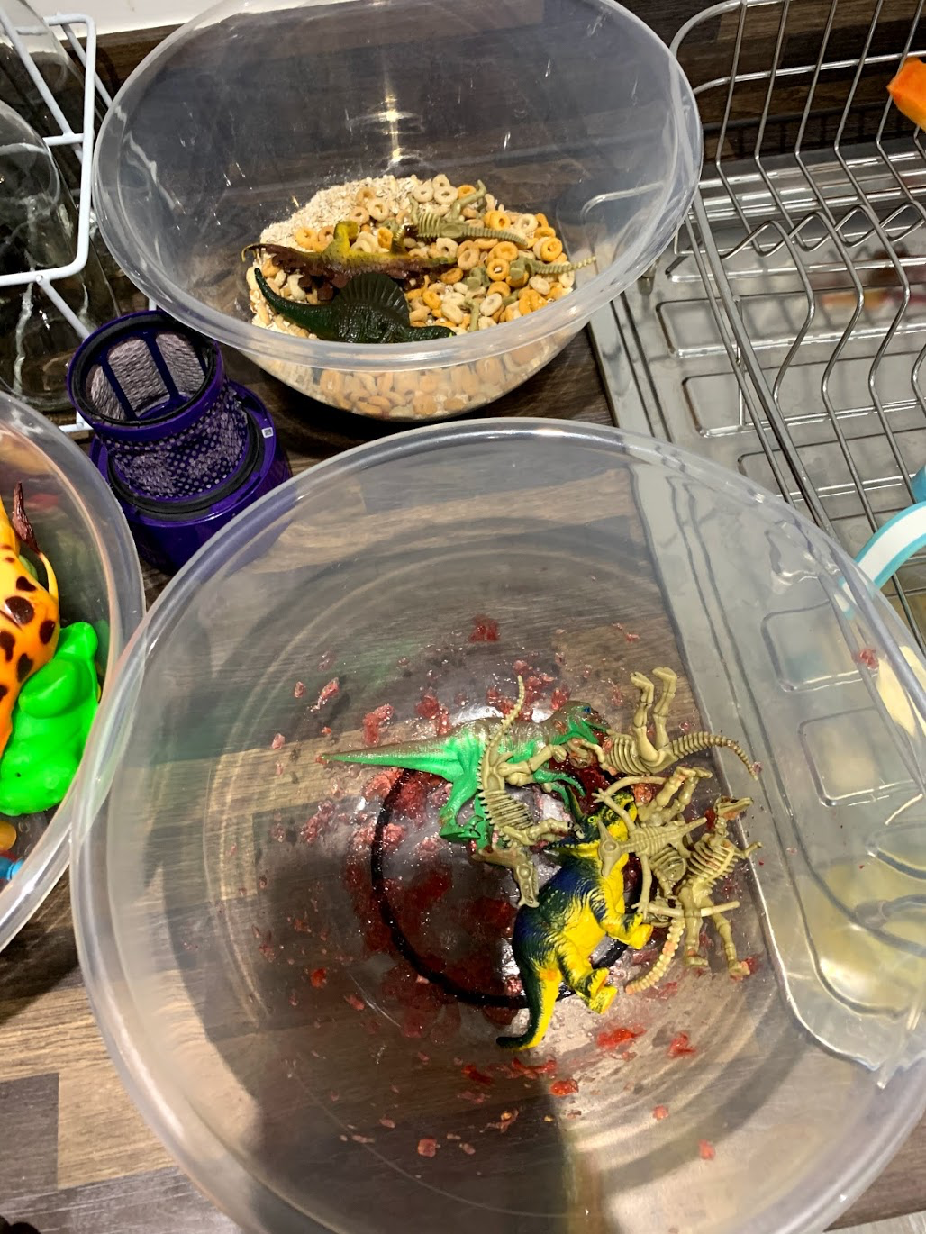Dinosaur Messy play – resources: dinosaur toys, big bowls, messy play materials (I used water, oats, cheerios, and jelly.