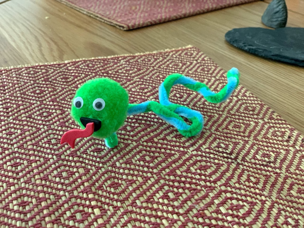 Pompom snakes – resources: pipe cleaners, craft pompoms, googly eyes, felt/paper (for the mouth and tongue), glue – we used a craft pack from Wilko to make the snakes but you could find all the materials for making them in shops such as Hobbycraft.