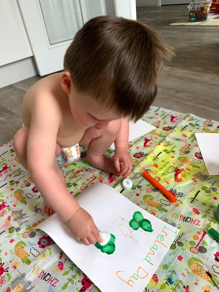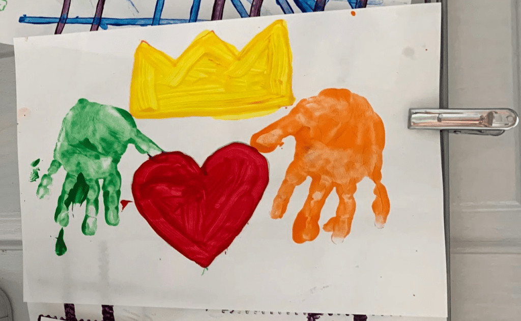 Here we simply painted Robbie’s hands and stamped them onto the paper, then used a paintbrush to paint the heart and crown. We talked about the meaning of the Claddagh and where you see it and why.