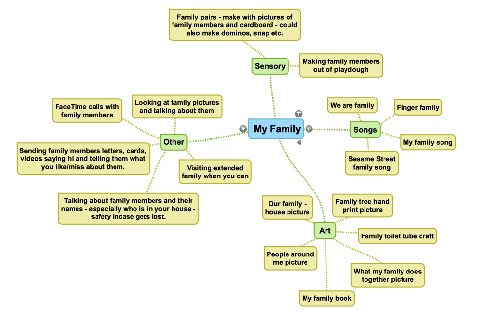 As lockdown (2020) and shielding were easing and we were able to start seeing family again I thought that a focus on our family was a good theme. We kept in touch with grandparents, siblings, cousins etc. as much as possible through video chatting and messaging, however, Robbie was always enthusiastic to talk about his family and asked questions about them so we decided to have a deeper look. This is easily adapted for nurseries and the infant years in the primary school topics. It could also be applicable to older years as a family study e.g. looking at genealogy/family trees and ancestors. Below I have added my planning mind map and detailed the activities we completed.