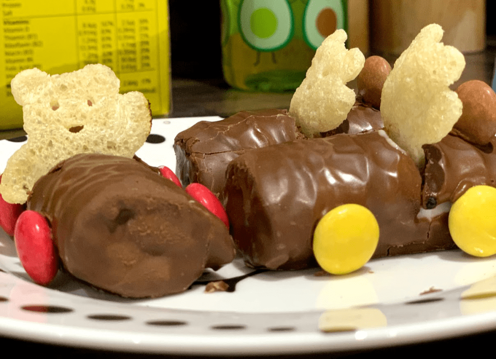 These were really easy and another great fun snack. We bought some Pombear teddybear crisps, Mini Rolls and Smarties from Asda. I cut a little slit into the Mini Roll and squashed a teddy crisp into it. I then used a match to melt the chocolate on the side of the Mini Roll a little bit and stuck Smarties on to resemble the cars wheels and steering wheel.