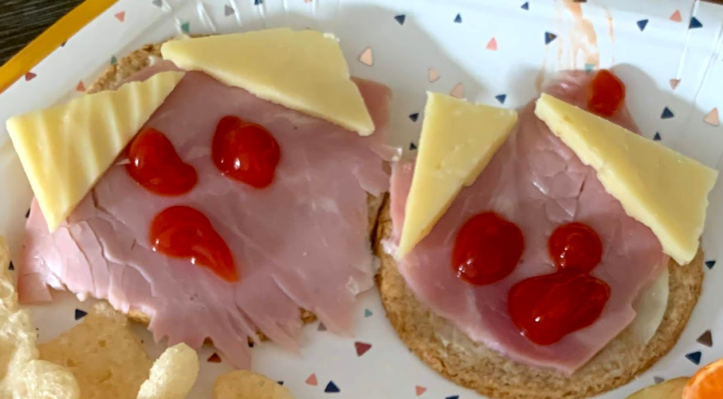 These were a fun substitute for the usual boring party sandwich. We used oatcakes as our base as Robbie was particularly enjoying eating oatcakes at this time. I cut some ham to fit on the oatcake, cut small triangles of cheese and placed these on as ears and used Ketchup to dot on eyes and a nose. They were a great hit and very filling.