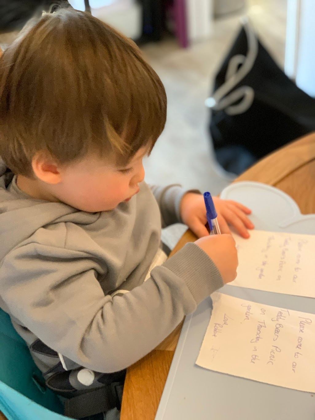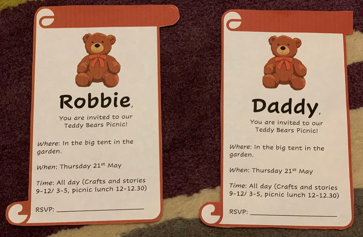 Robbie also wrote his own invitations for all his teddies using plain paper and pens. He told Mummy what to write and then signed them himself.