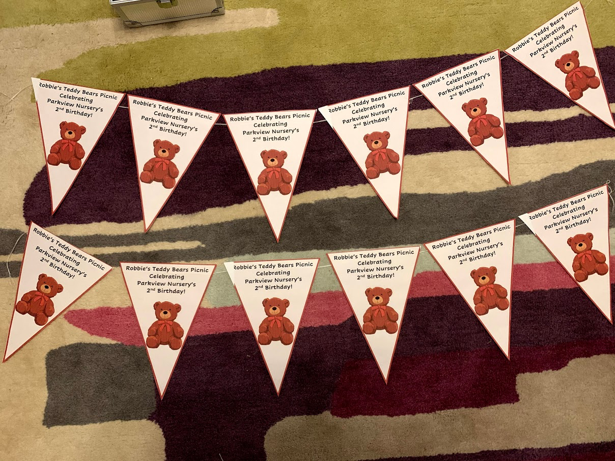 As this was a party I wanted to make the day a little more special for Robbie and decided to make some simple decorations. To make this bunting I used Microsoft Word on my computer. I inserted 3 triangle shapes onto the page alternating in direction. I then used Google Images to find a teddy bear picture I liked and saved this to my computer so I could insert it as an image onto my triangles. I then added a text box with the writing and copied and pasted this as many times as I needed. You can highlight the different sections of one triangle at the same time and “group” them so that they don’t become unformatted during copying and pasting. I printed them, cut them out and used Sellotape to attach them to some string so I could hang them up for the party.