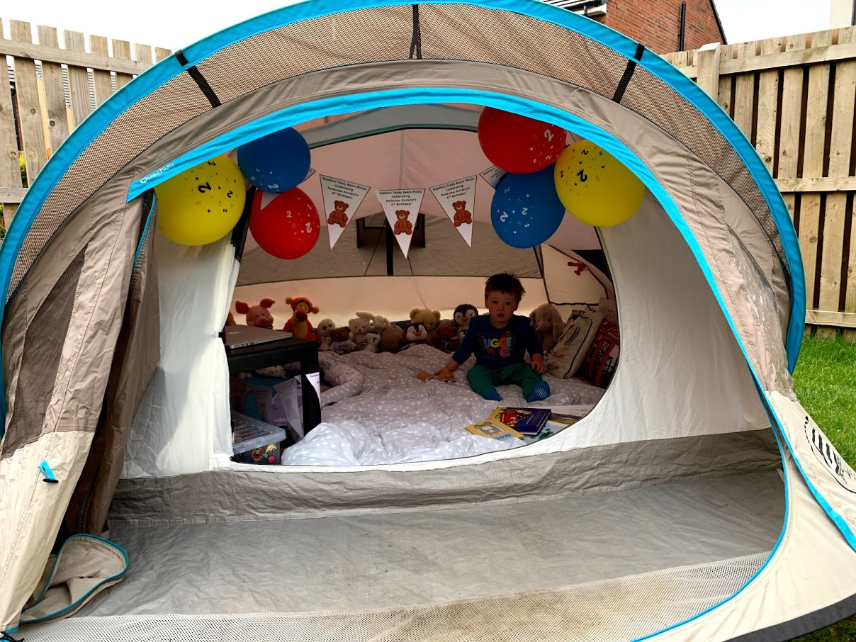 The Tent – needed: a tent (you could also make a tent using old sheets etc.), cushions, blankets, duvets, Teddybears, homemade decorations, balloons, small table, computer.