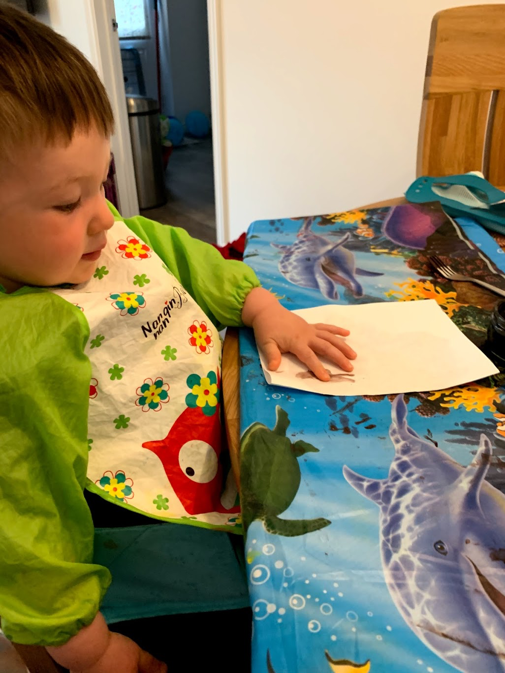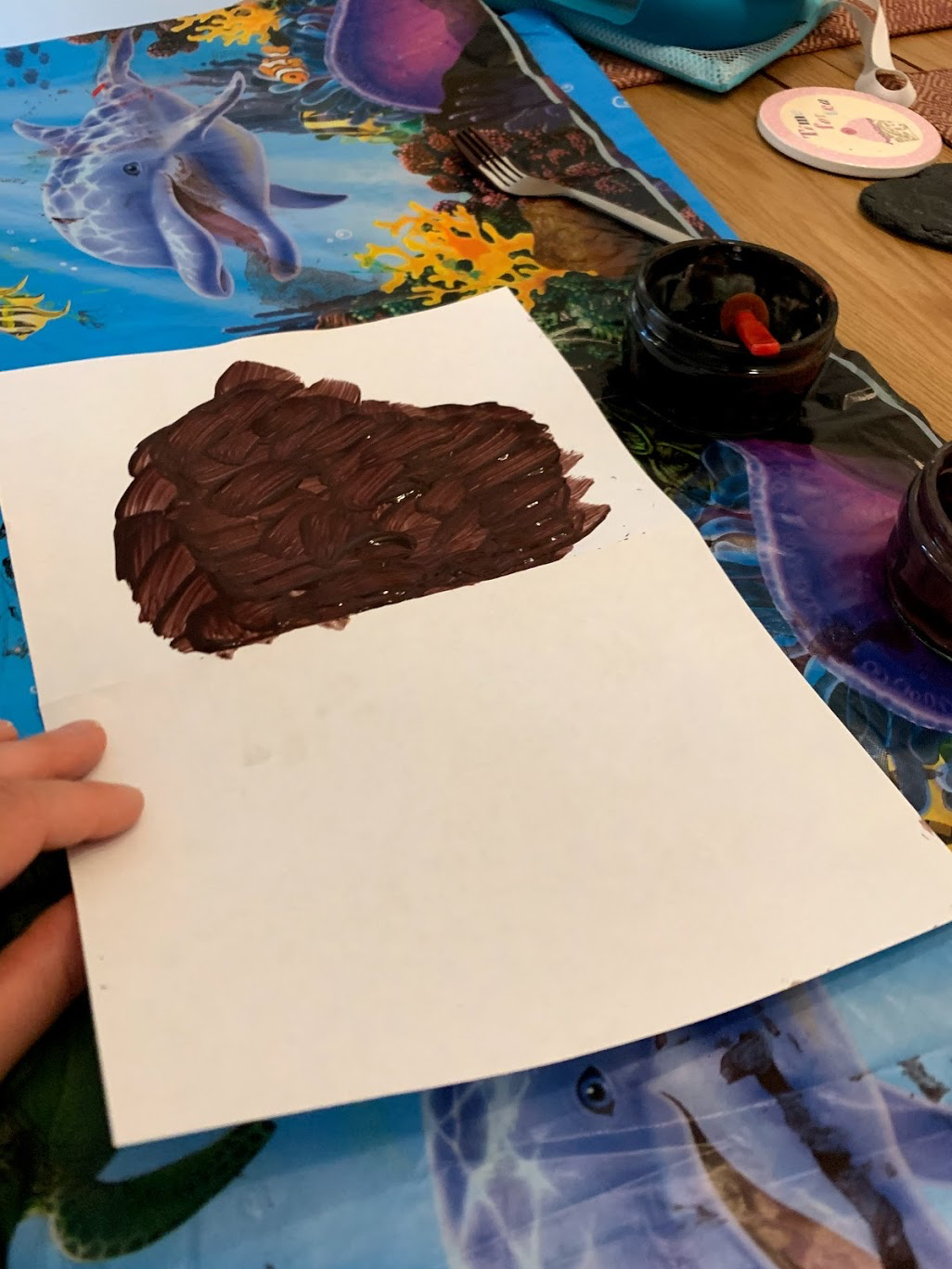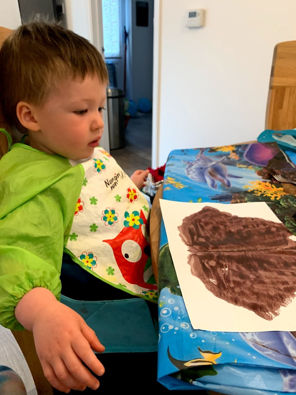 We folded an A4 piece of paper in half and Robbie used the brown paint to create a large shape on one side of the paper, making sure there was a good amount of paint used. We then folded the paper over and pressed down over the painted areas, transferring the paint onto the other side. We opened it and let it dry. We drew ears and a nose on more plain paper coloured them in and cut them out. Finally, we stuck the ears, nose and googly eyes on.
