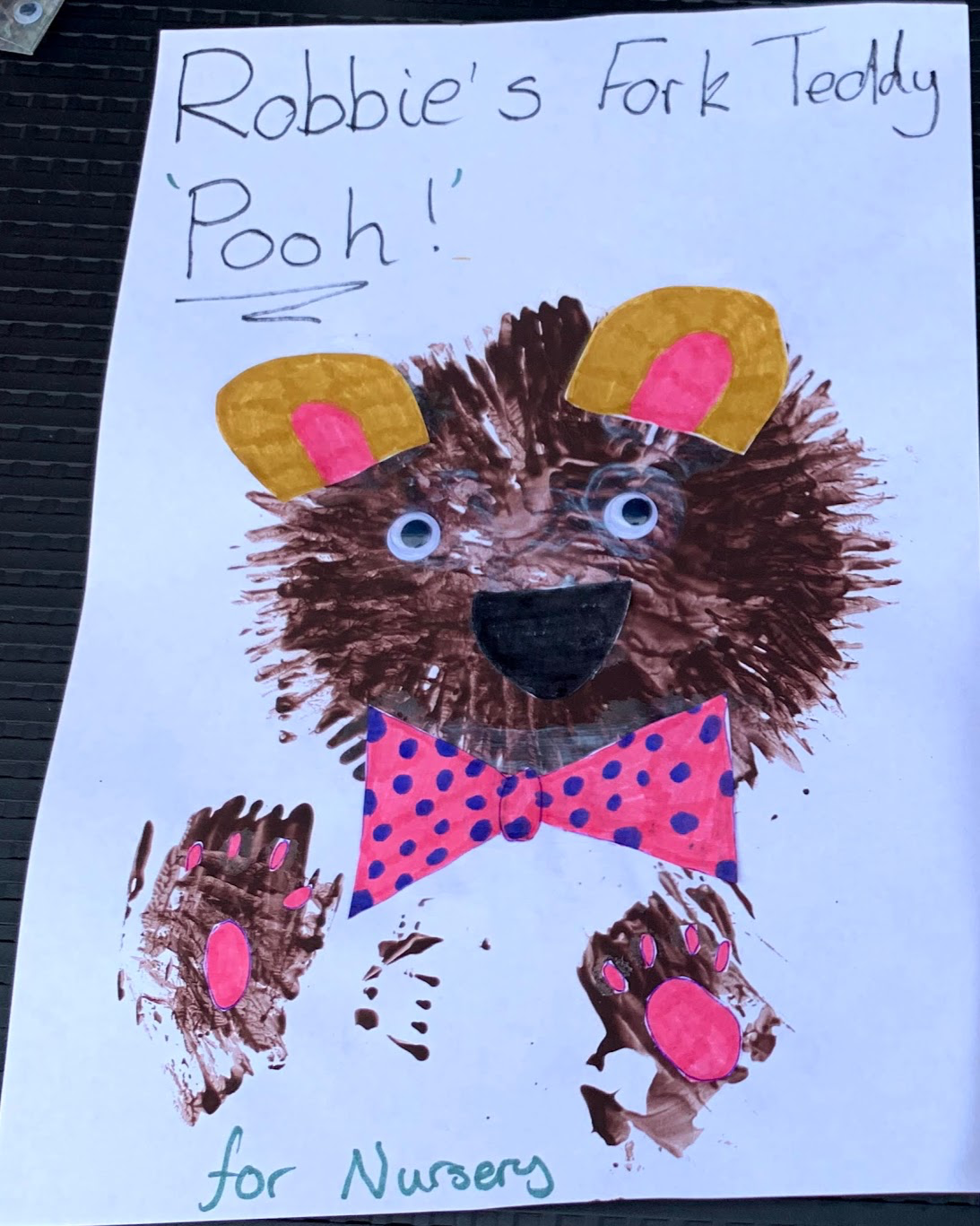 Fork Stamping Teddybear Picture – resources: plain paper, brown paint, fork, pens, scissors, glue, googly eyes.