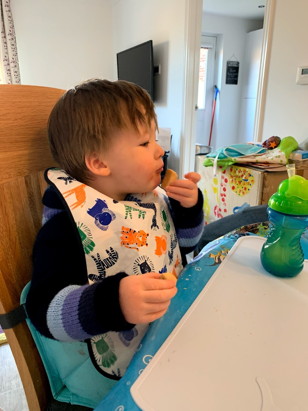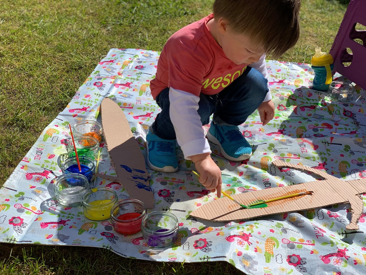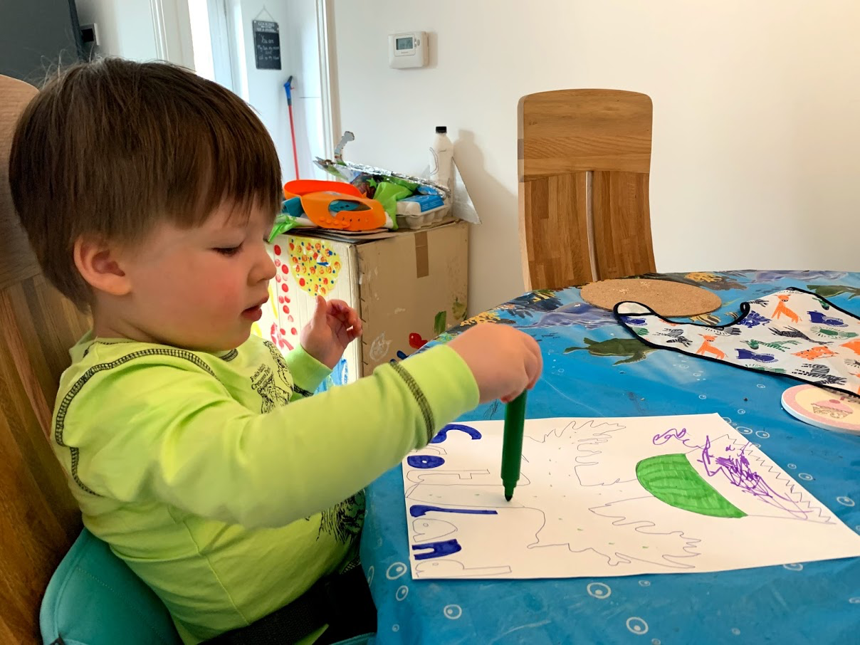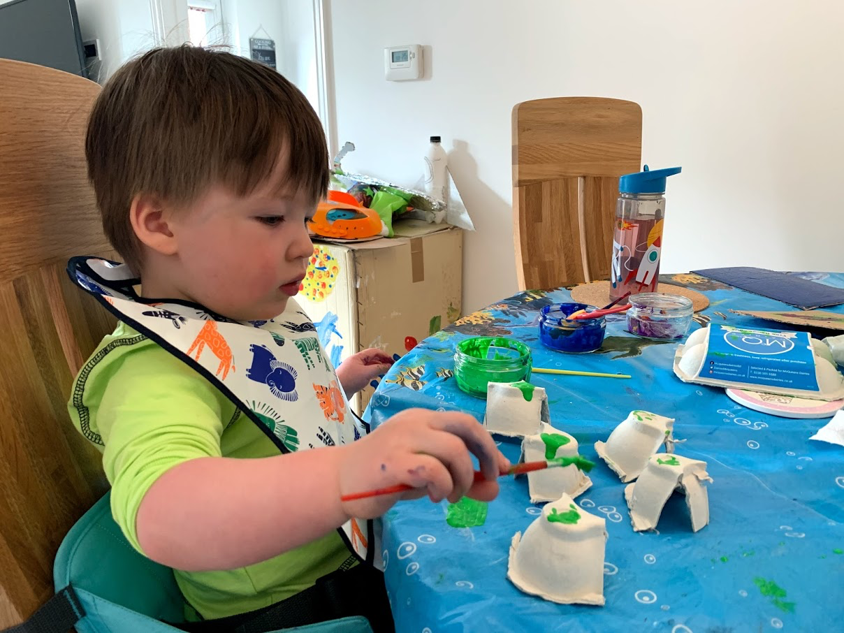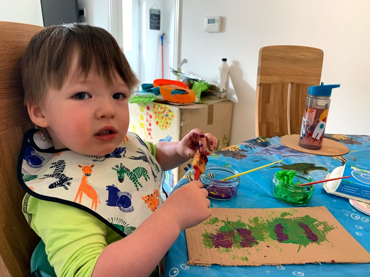 Robbie likes painting freely so this activity was great fun for him. I gave him some cardboard and some green paint which he used to make big green splodges. I then gave him dome purple paint and a different brush and showed him how to make some neater lines and splodges which he copied, creating this nice little abstract picture.