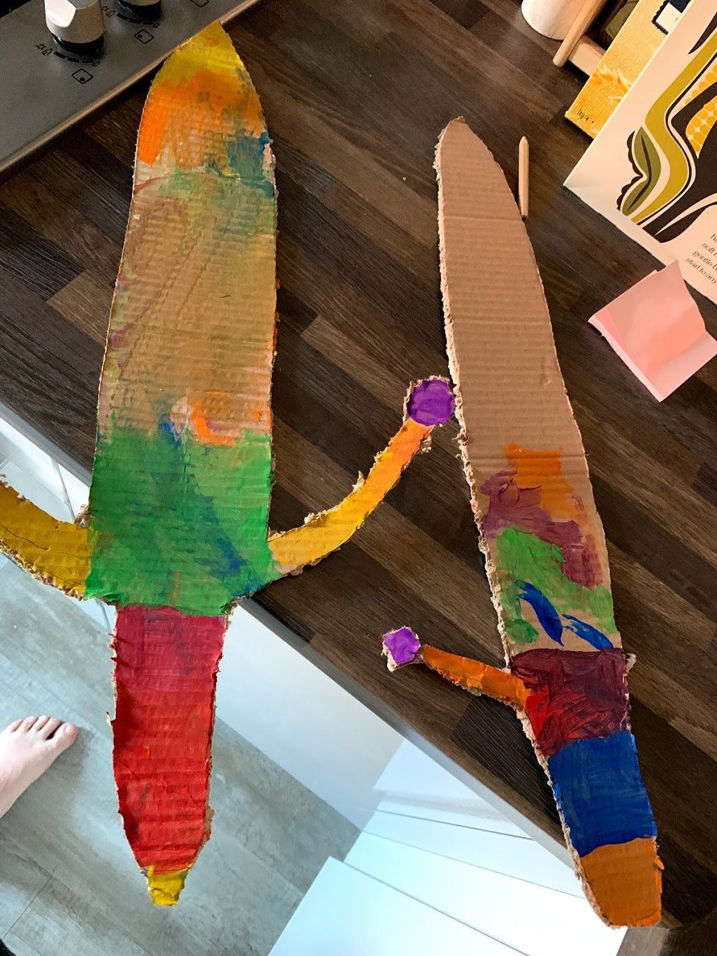 Claymores are traditional Scottish swords. They are heavy and essential for battle, so naturally, this was the first activity we did. To make the swords we drew the outline onto a piece of cardboard and cut it out using scissors. Robbie then painted them. Once they were dry we wrapped tinfoil around the blade.