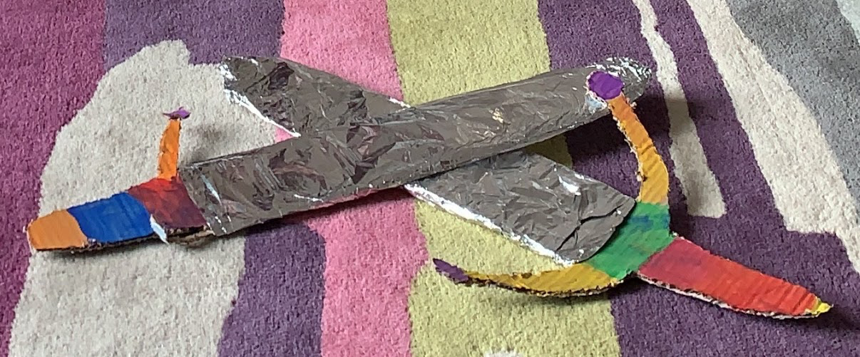 Claymore Craft – resources: cardboard, scissors/Stanley knife, paint, tinfoil.