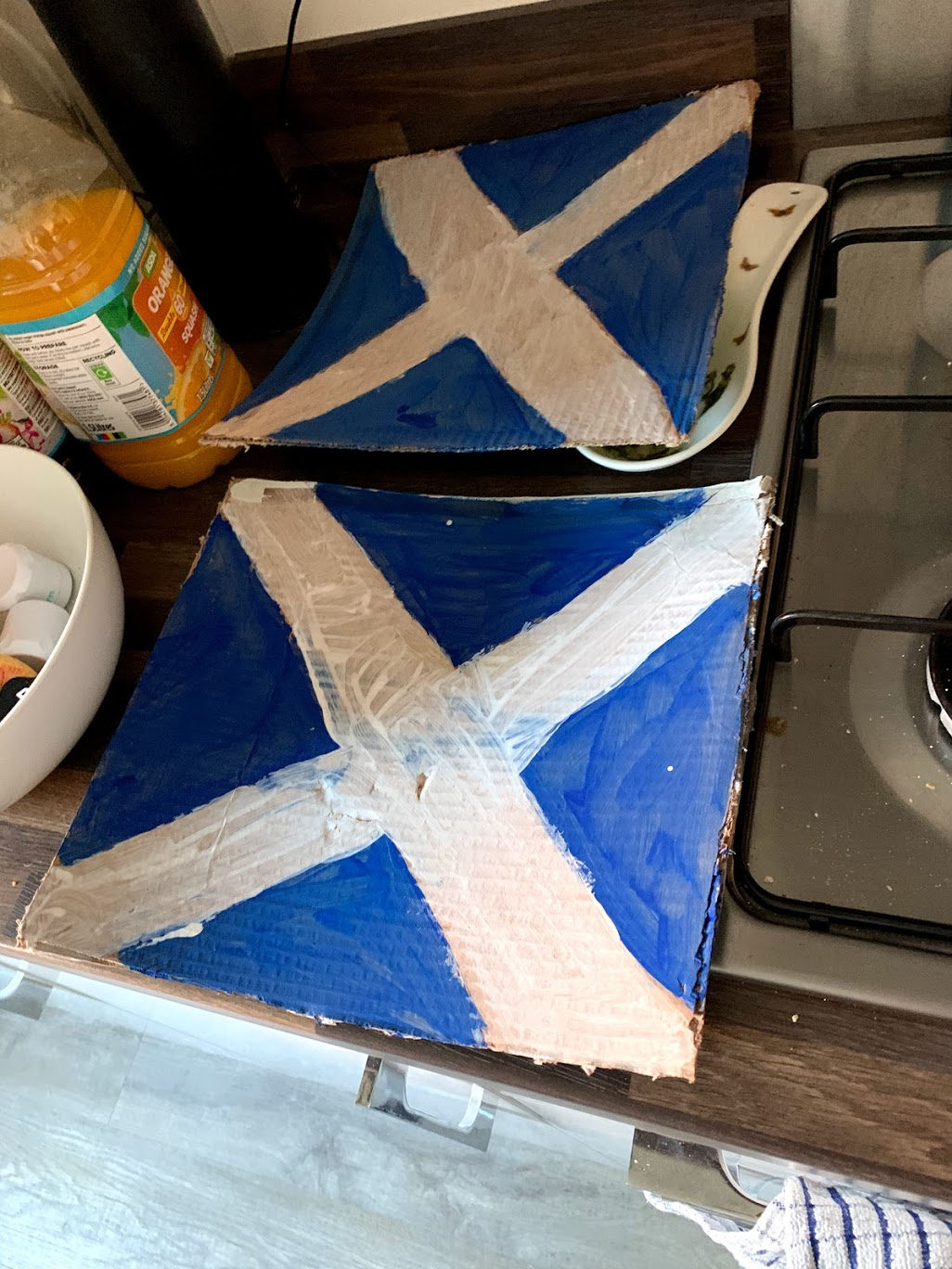 We couldn’t have a Scottish themed week without making some Scottish flags. We cut out a square of cardboard and drew the St Andrew’s Cross onto it. Robbie then painted the cross white and the background blue.