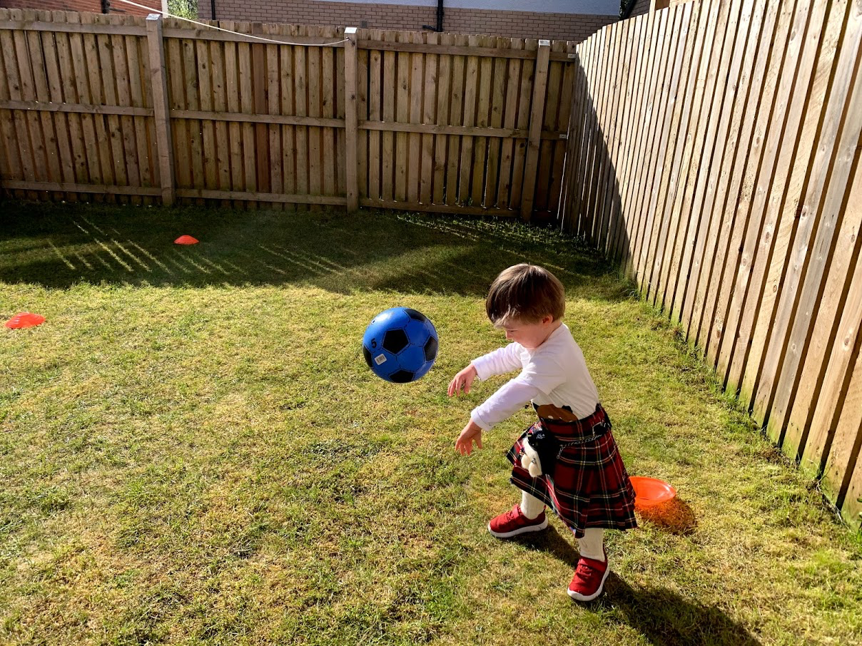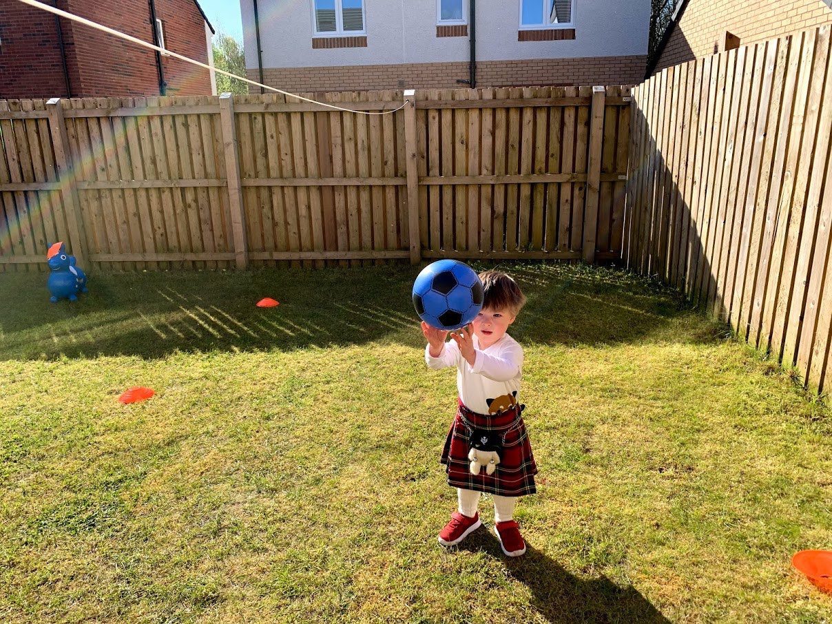 Traditionally this event is where a heavy weight is tossed over a high rope, however, we substituted a football for the weight and used our washing line as the rope. This was still really tricky for Robbie, but he had great fun trying to get the ball over.