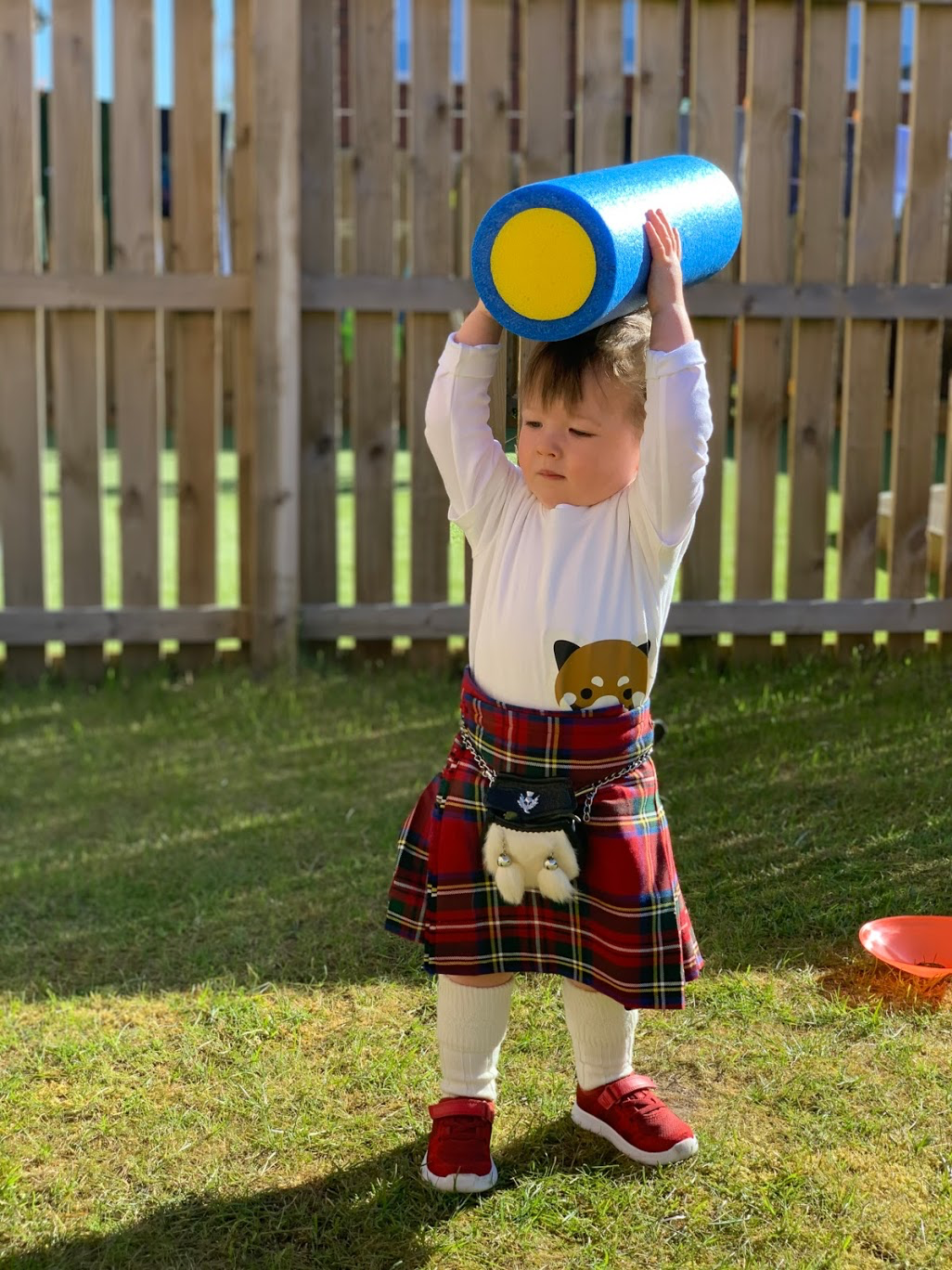 A traditional caber toss sees the participants attempting to launch a large, heavy tree trunk as far as they can. They usually hold the caber from the bottom and almost push it up and away from them. We decided to use Daddy’s foam roller instead as we had no tree trunks to hand.