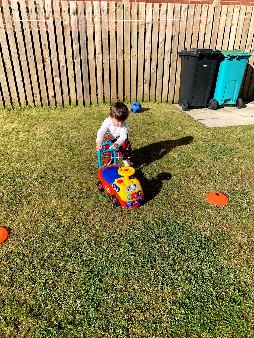 Robbie pushed his ride-on Mickey car in and out of cones up and down the garden.