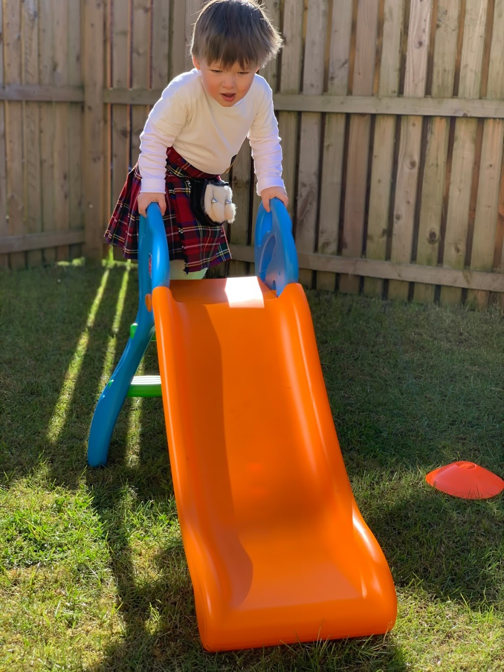 We used Robbie’s garden slide and bouncy “Rody” horse for this event. Robbie needed to slide down the slide then do 5 bounces on Rody, then slide back down the slide again.