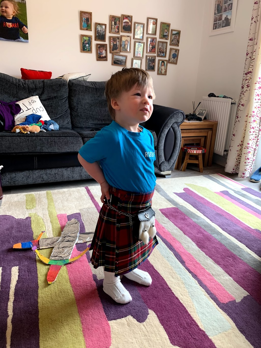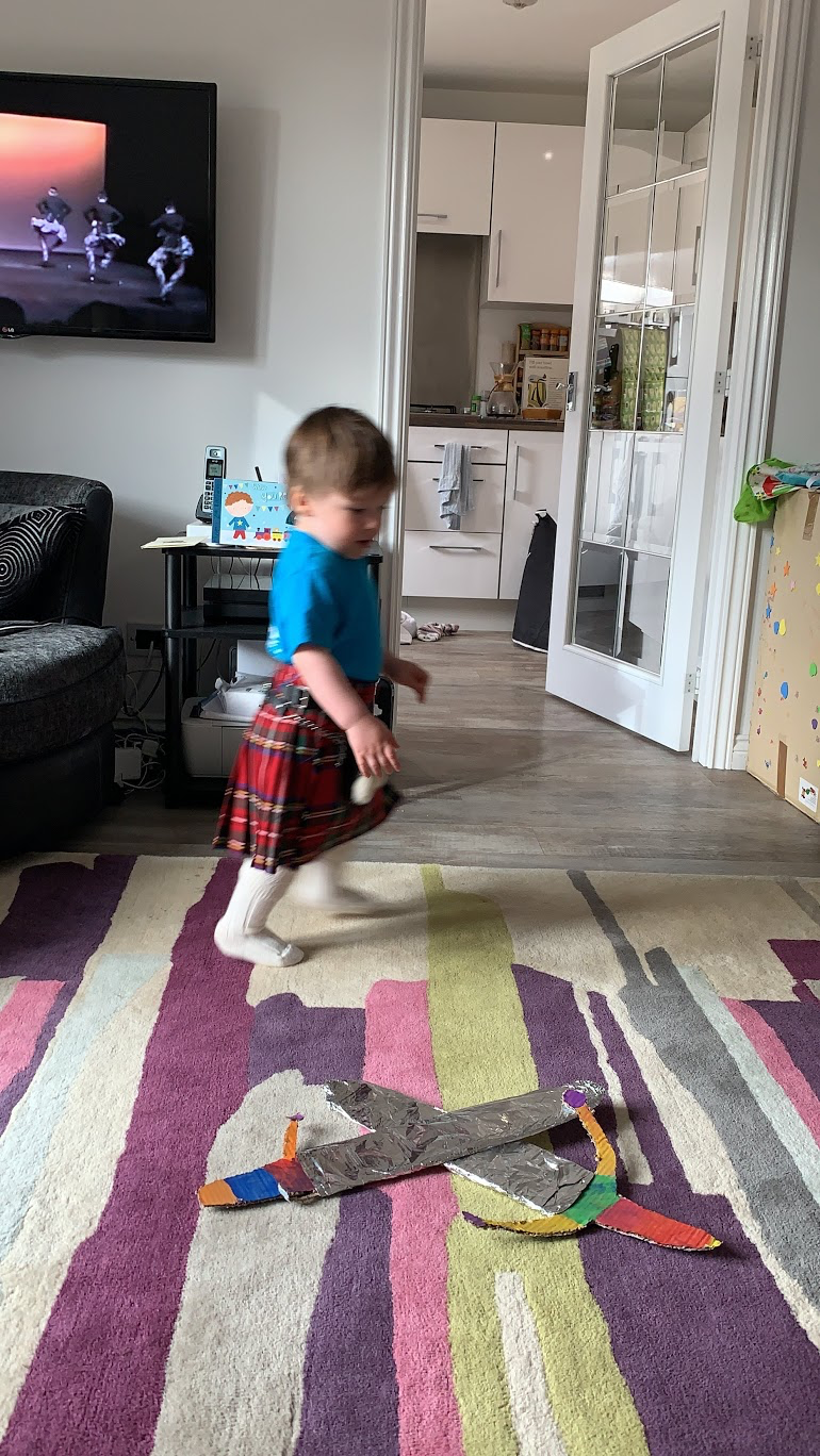 I have very fond memories of my brother breaking into a Highland Fling randomly when he was little so I was keen to give Robbie the chance to see what it was all about. We found a video of a Highland Fling on YouTube which we watched several times. We talked about what the men in the video were doing and had a wee practice. We then set out our swords and danced along with the video, getting all the arm positions spot on.
