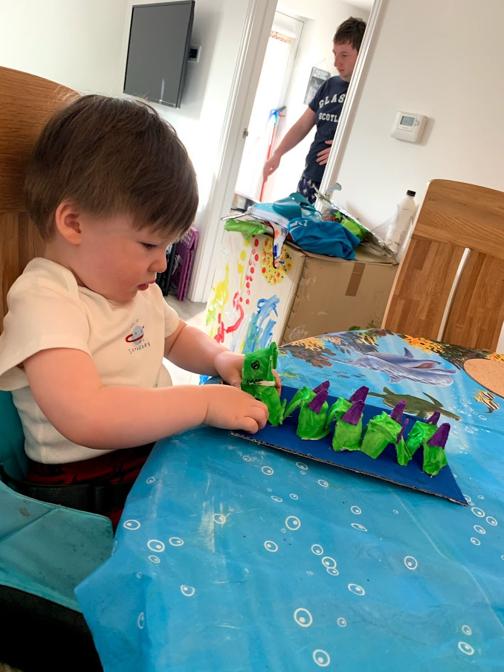 This was a really effective and fun activity. First, we painted the cardboard base blue to resemble the Loch. Then we painted the egg box parts green. We had cut the divider parts of the egg box off and we painted these purple. After everything had dried we stuck the egg box sections onto the blue base and the purple spikes on with glue.