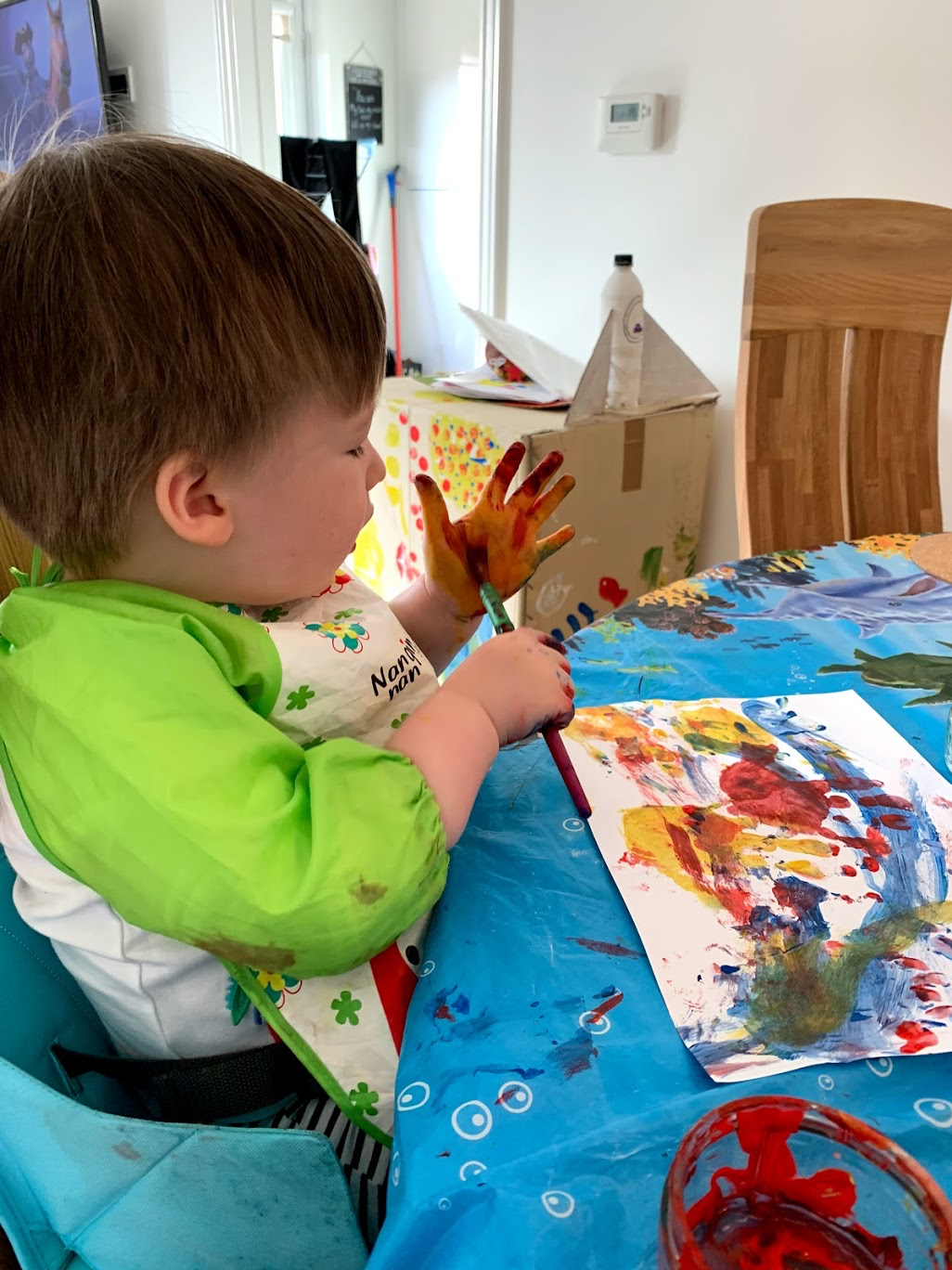 We originally started this activity with the intention to create handprint fish for an under the sea picture later in the week, but Robbie had so much fun that he decided he wanted to paint his own Seascape picture for his fish right then and there. For the fish, we simply painted Robbie’s hands and stamped them on the paper with his fingers together and thumb sticking up to give the shape of fins and tails. Once they were dry we painted on eyes, suckers and scales. He then enjoyed some free painting and created a lovely background for his sea life.