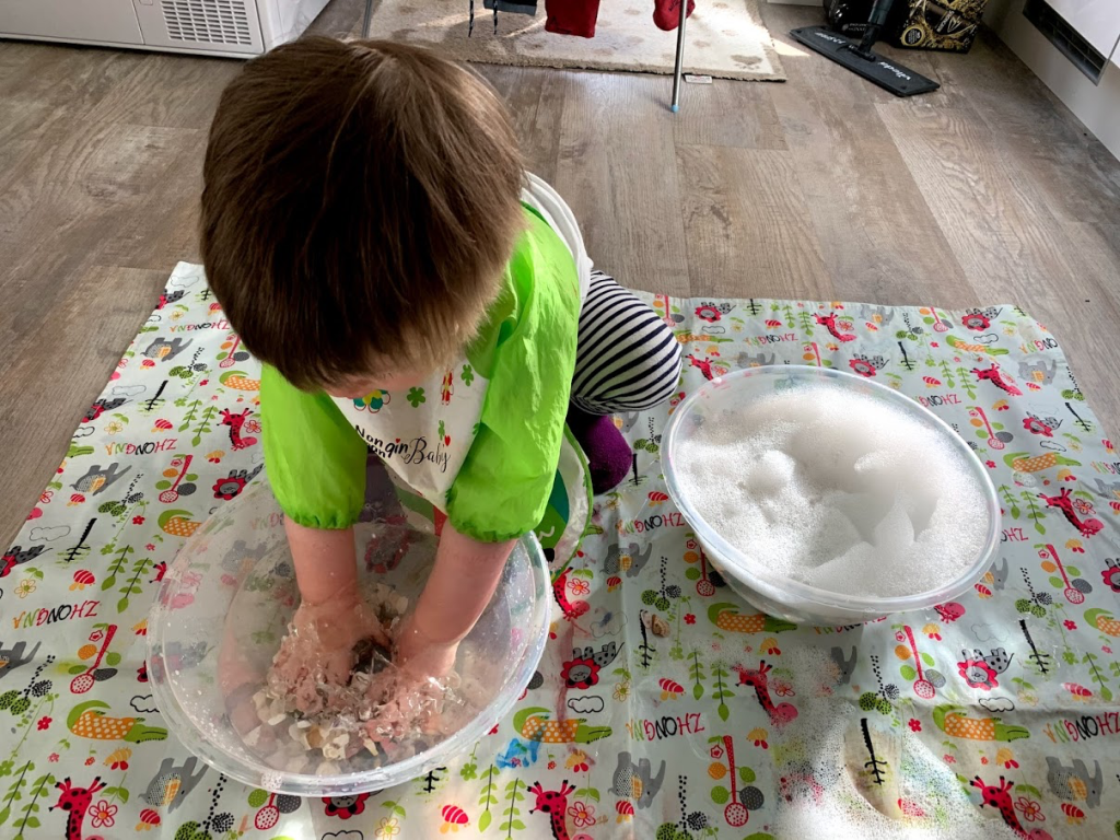 Water Play and Exploring Shells – resources: bowls filled with warm water/water and washing up liquid, shells (ours were bought from amazon as we couldn’t get to a beach – lockdown 2020 -, but collecting shells would have been much more fun), sea creature toys.