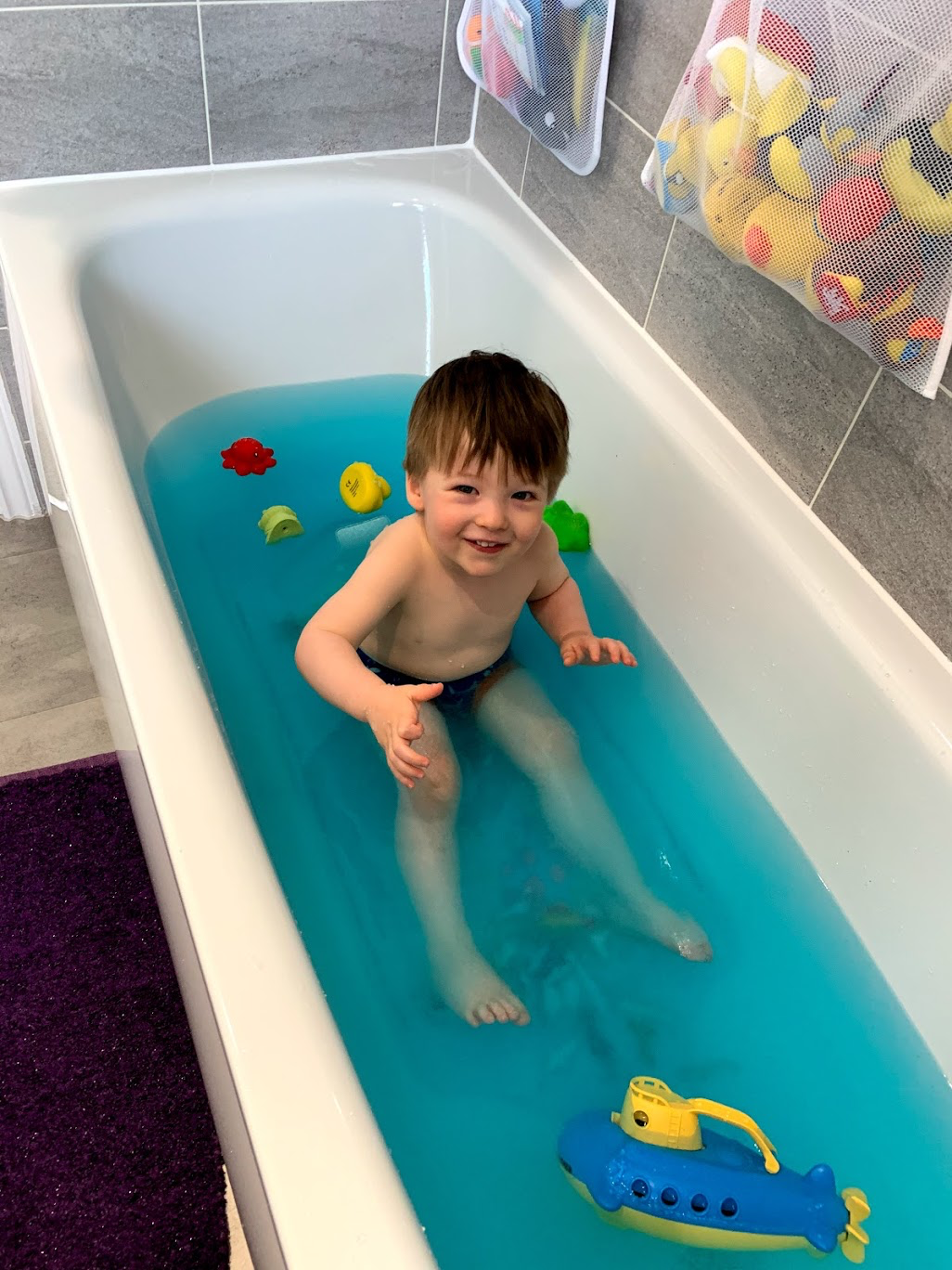 I, however, didn’t read the instructions and ended up using far too many for my small bowl. This resulted in solid blue globs of Gelli Baff and not much to play with so we decided to move our activity into the bath where we could get the balance between granules and water right. Once we had achieved this we had great fun playing with Robbie’s bath toys and his under the sea creatures in his bath.