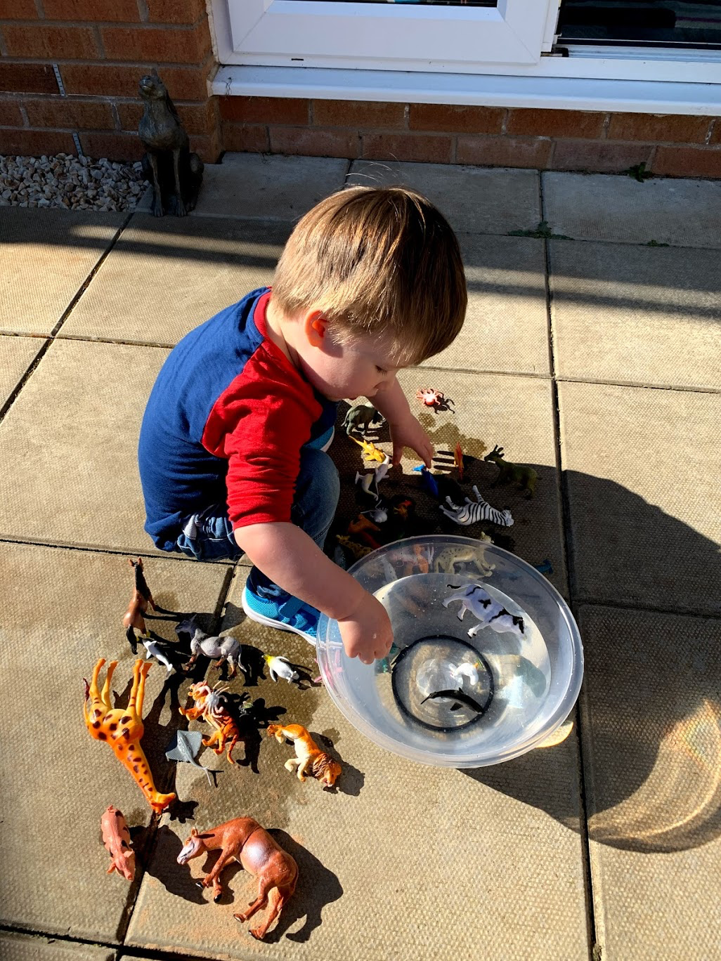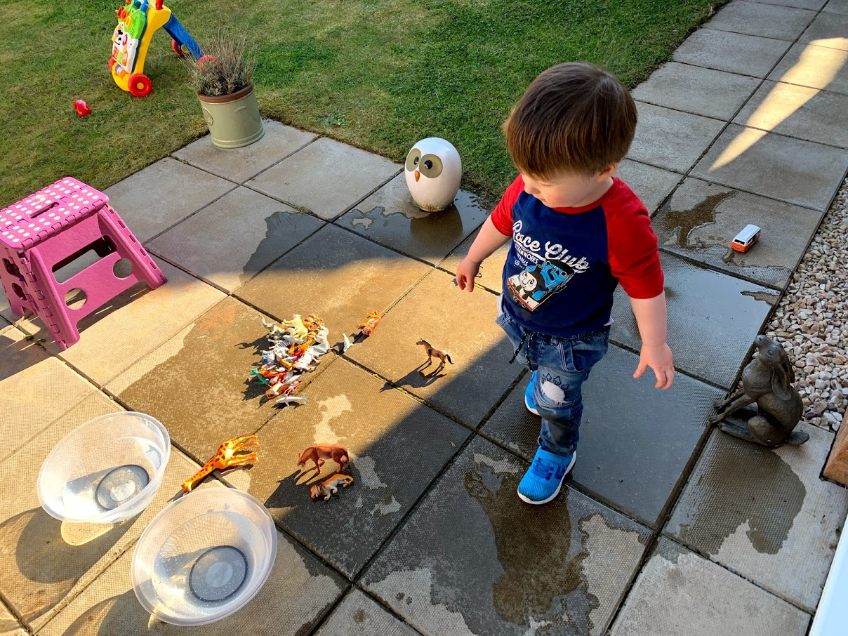 We revisited this activity many times throughout the week, also adding in Robbie’s other toy animals, inside and outside. The best part of outside water play is being able to spill the water out everywhere and jump in the puddles though.