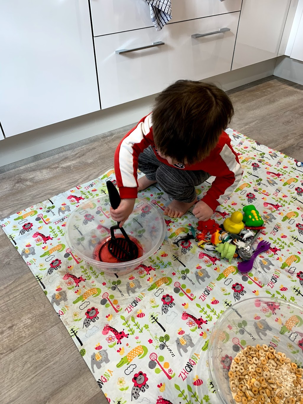 We made some jelly the day before and used a large bowl to set a third of the jelly mixture. We put some oats and Cheerios into bowls, brought out the sea creature toys and some utensils for Robbie to use and let Robbie have free play with these materials.