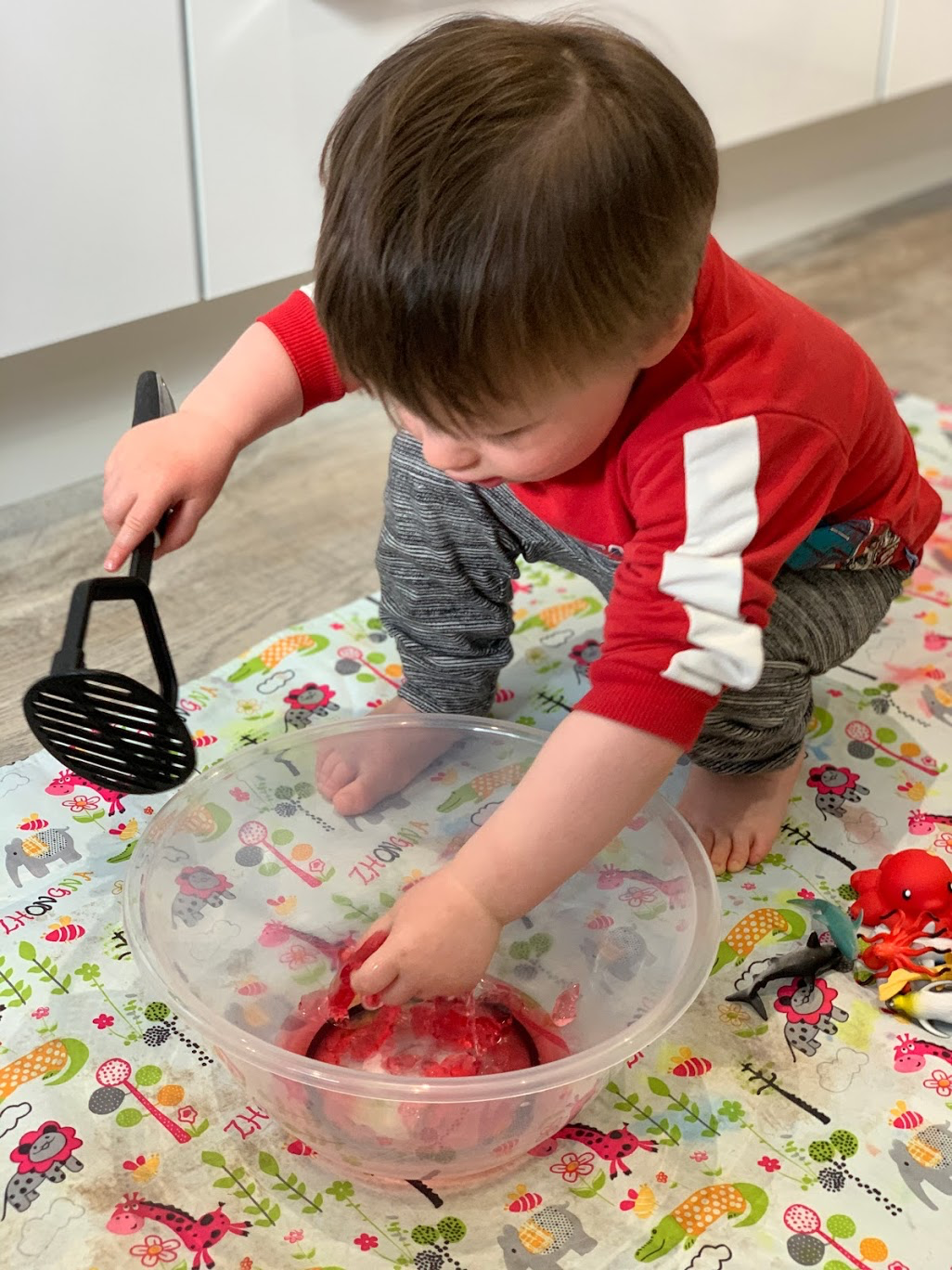 While Robbie loved this activity he preferred eating the jelly and Cheerios to actually using the toys to play in them.