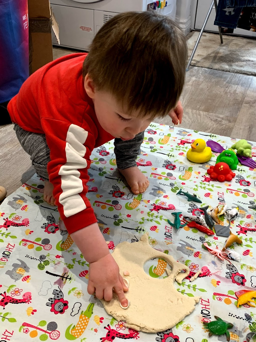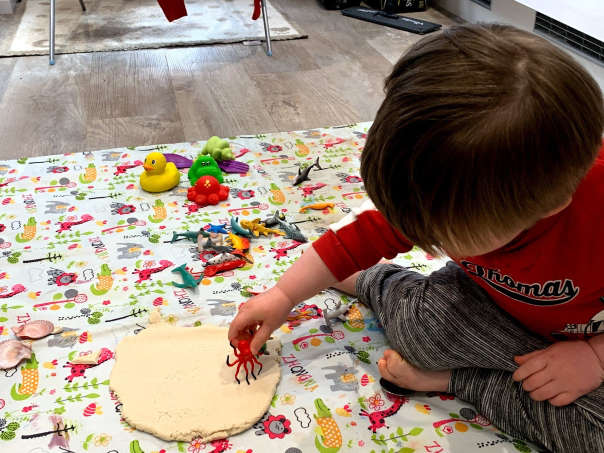 This activity was a great way to explore the different shapes of the sea creatures we had. Robbie rolled or squashed out his playdough, then pressed some of the sea creatures into it to see what marks they would leave.