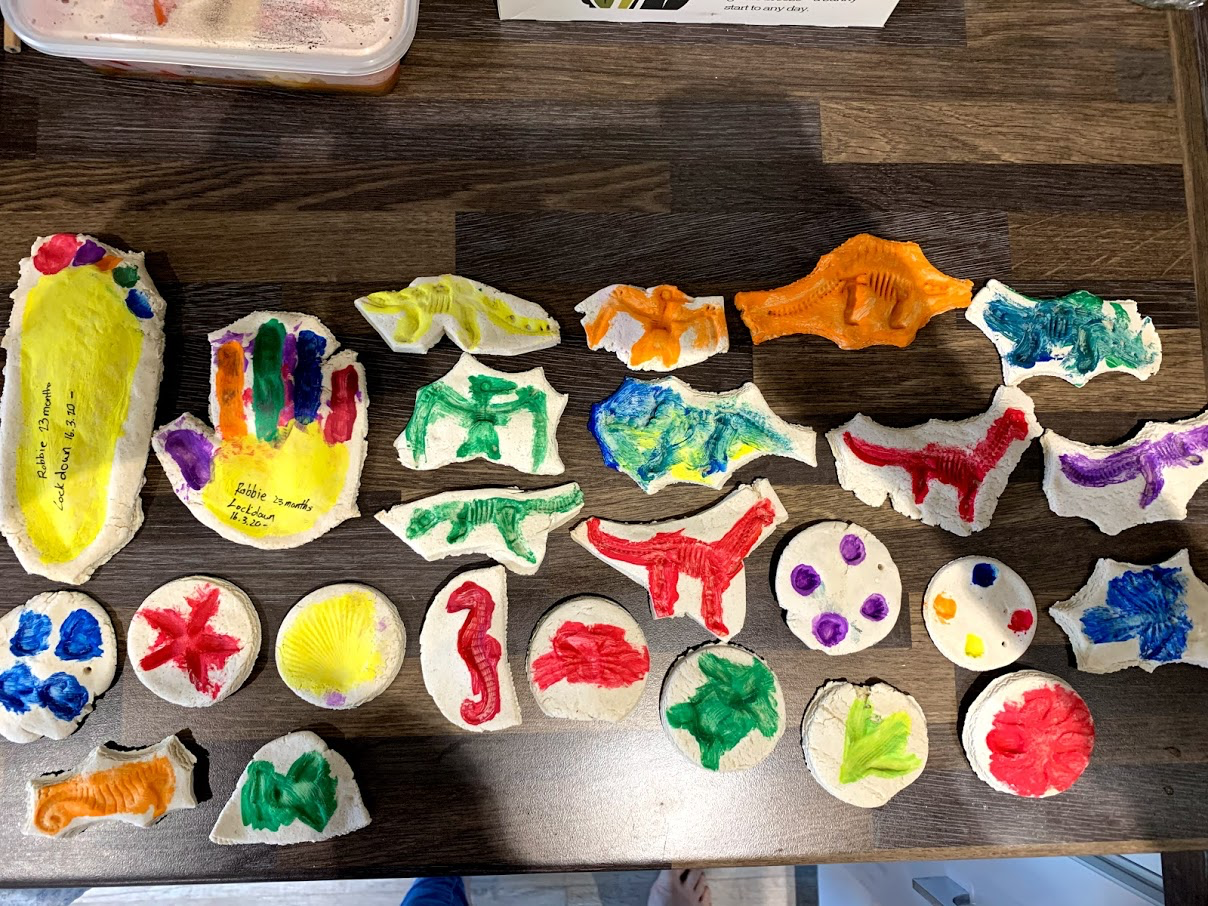 Salt-dough is great fun and super for making long-lasting crafts. We used Robbie’s sea creature toys to press into the dough leaving little sea creature fossils. We used a glass to cut these out and baked them in the oven until they were dry. After they had cooled we painted them bright colours.