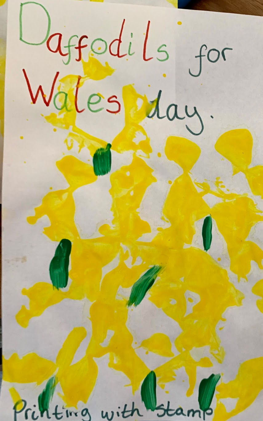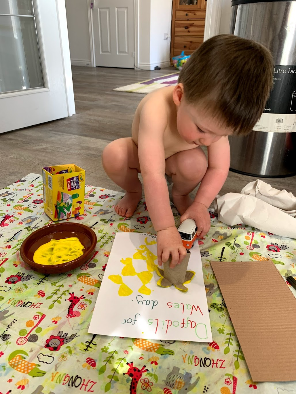 We used the stamps we made for the daffodil stamping picture but cut them to a smaller size. We painted these yellow and while they were drying we found a rectangular piece of cardboard and painted it two different colours that Robbie chose. Once everything was dry we stuck the daffodil tops on to the painted background using the sellotape, we had tried Pritt-stick and stinger glue but found that the most effective method was using sellotape. Finally, we drew stalked on using green crayon.