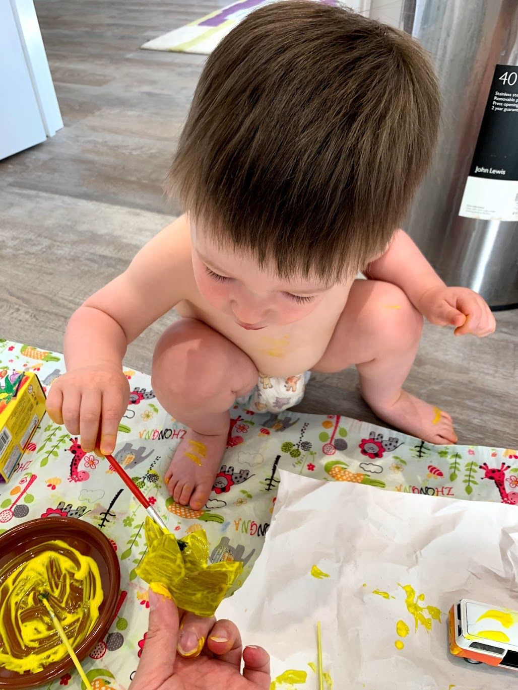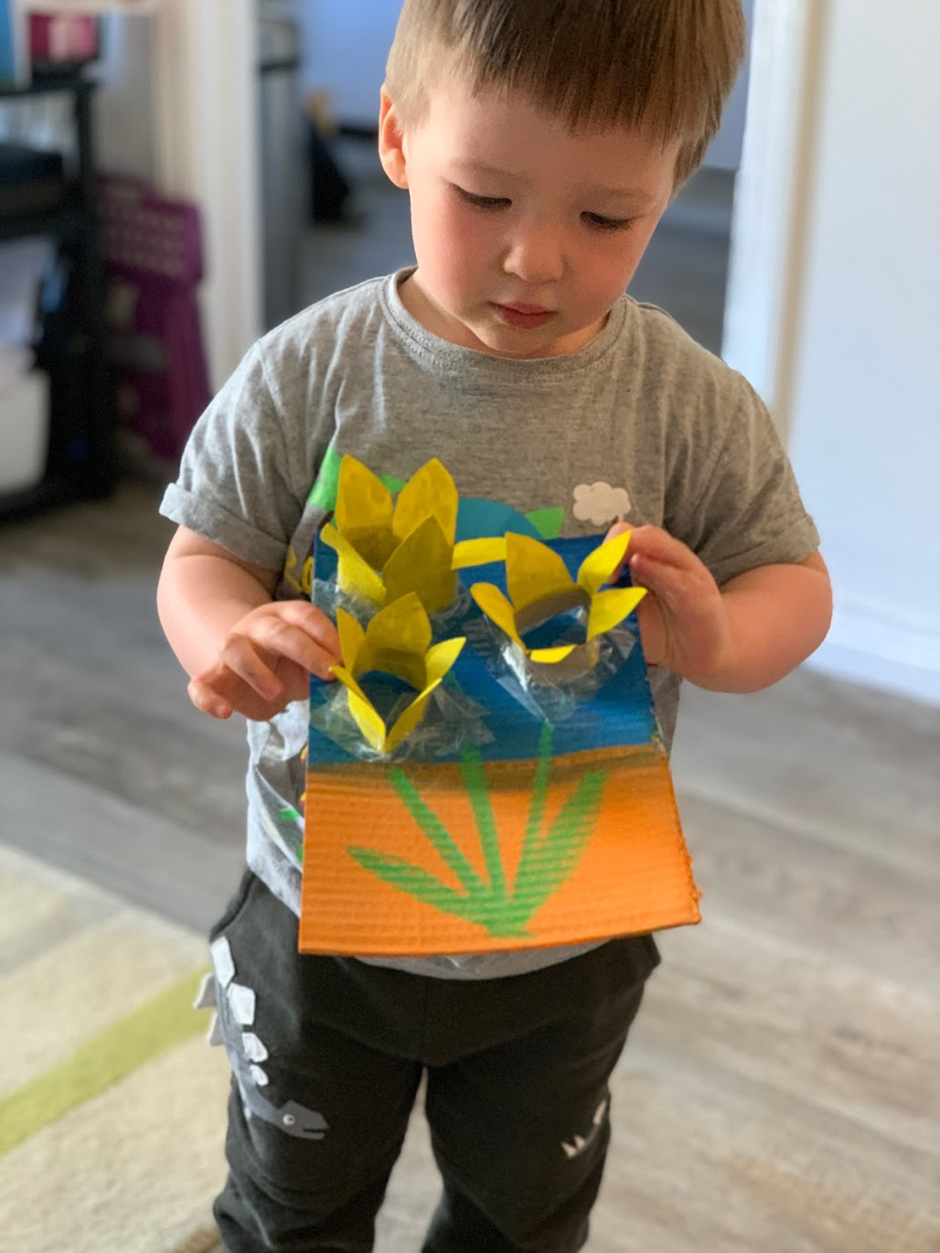 I cut the top of toilet tube into 5 sections then rounded the top of them off into a rough petal shape. This made a great stamp that Robbie could easily hold and use. We put yellow paint into a shallow dish, dipped the stamper into the paint and stamped it onto the paper. Once this was dry Robbie added a little green stalk with some green paint and a brush.