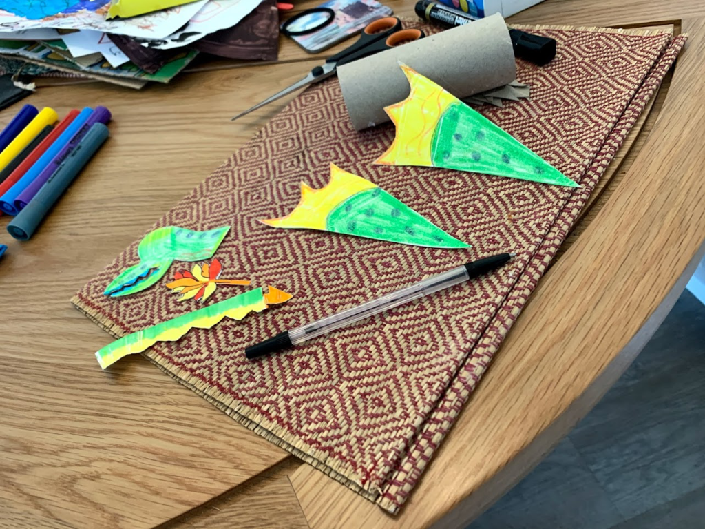 We first cut a paper plate in half to use as the dragon’s body, then cut wings, a head and flames out of the other half. We coloured the different parts and stuck them together with Pritt-stick and Sellotape. Finally, we stuck on a lolly stick and google eyes.